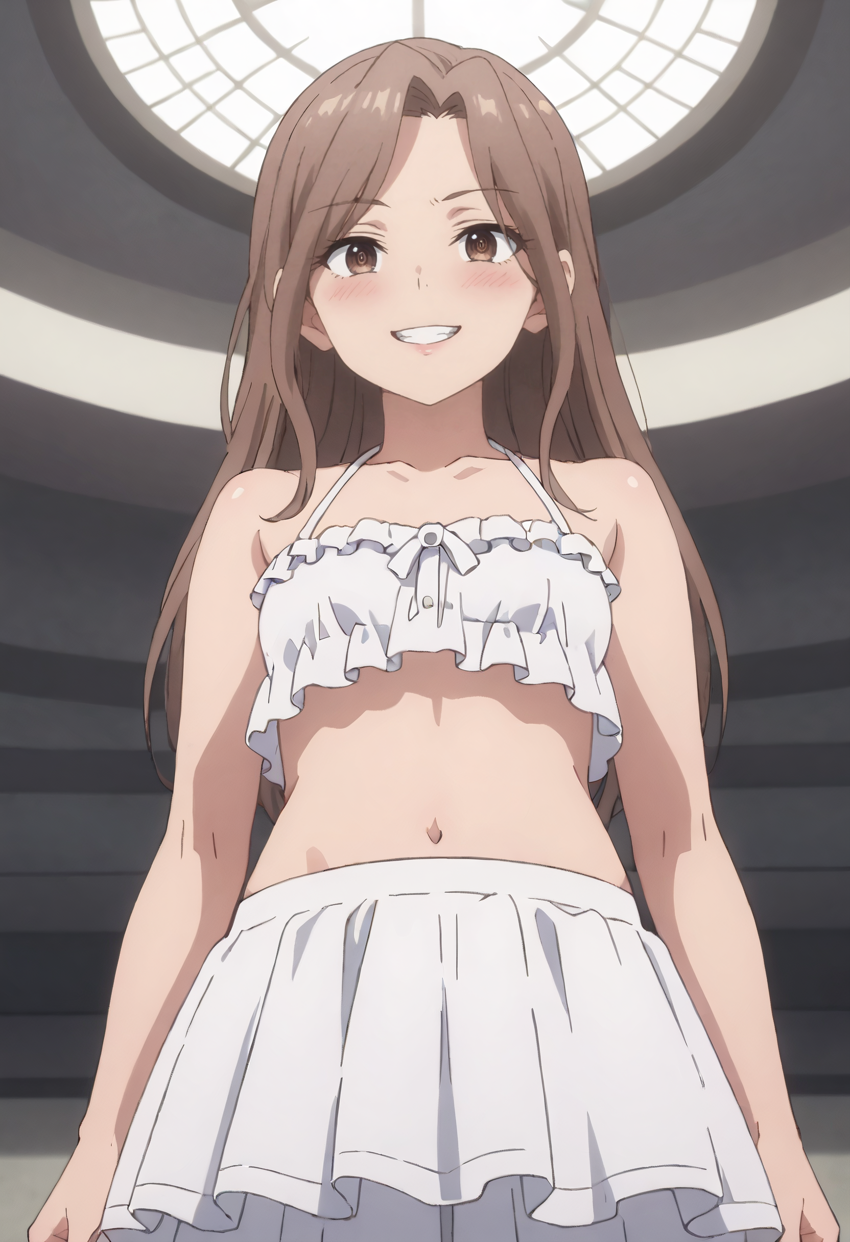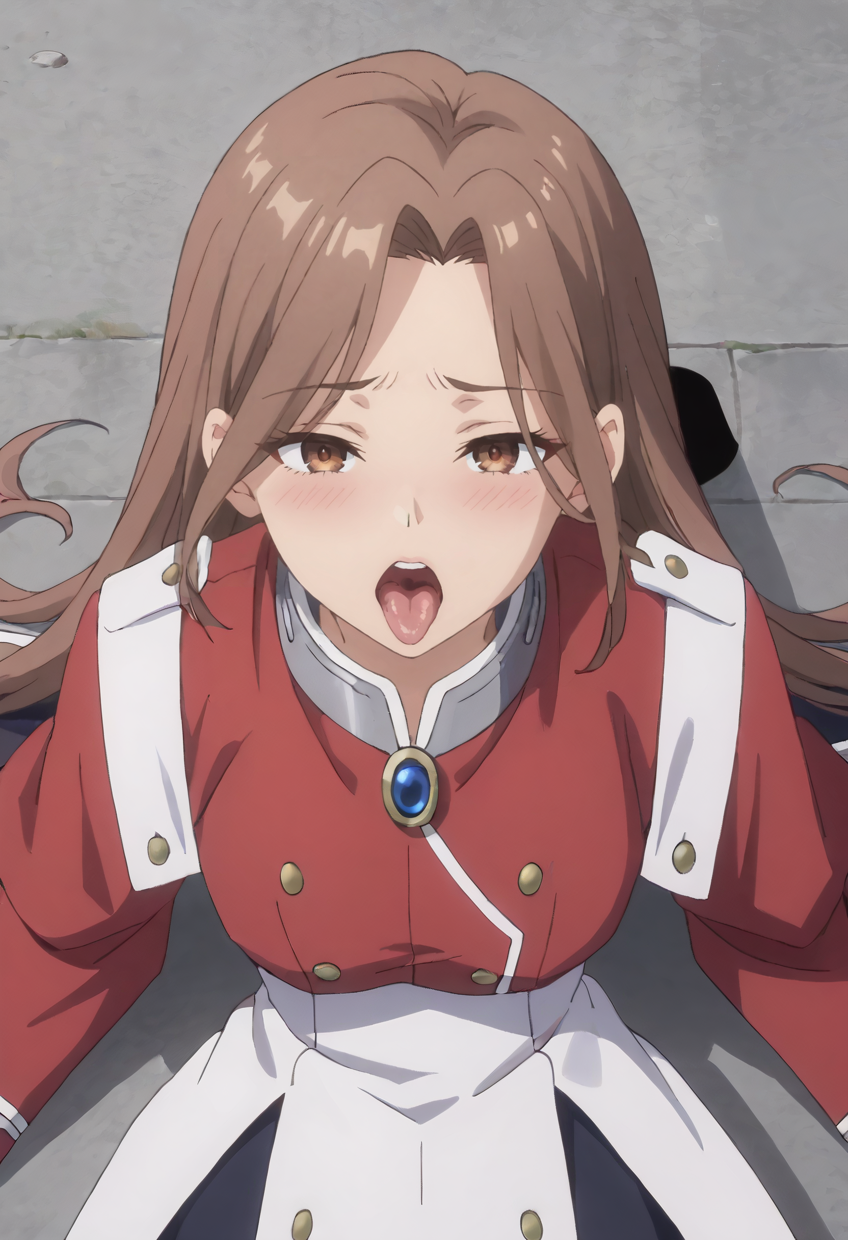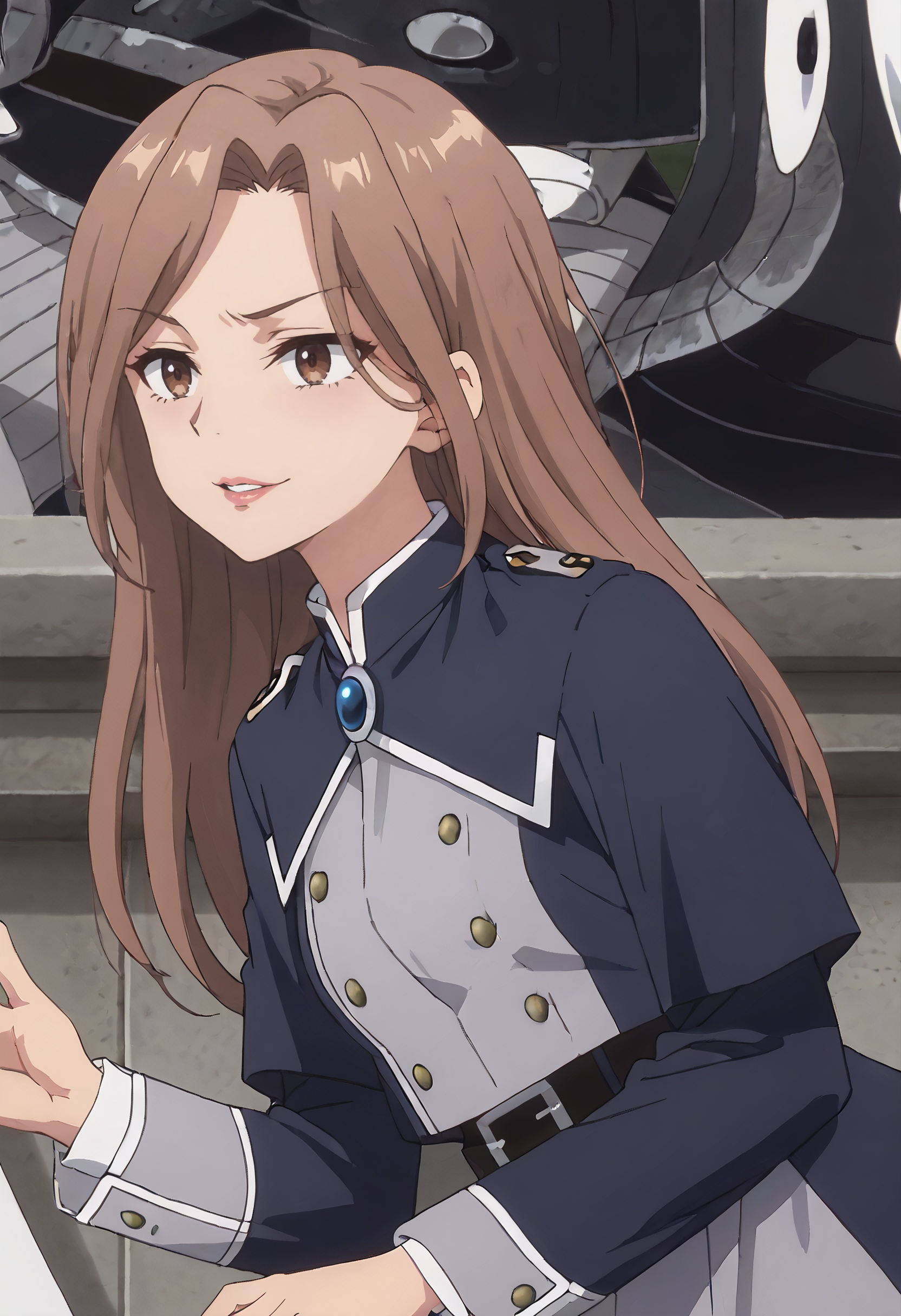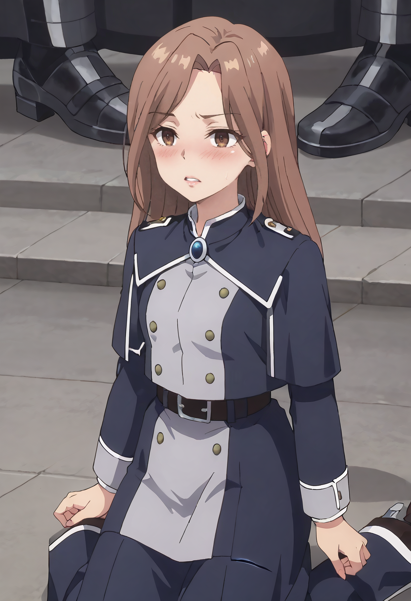 GirGuide、茶色の髪、長い髪、茶色の目、前髪、分け目のある前髪、髪の間から見える眉毛、