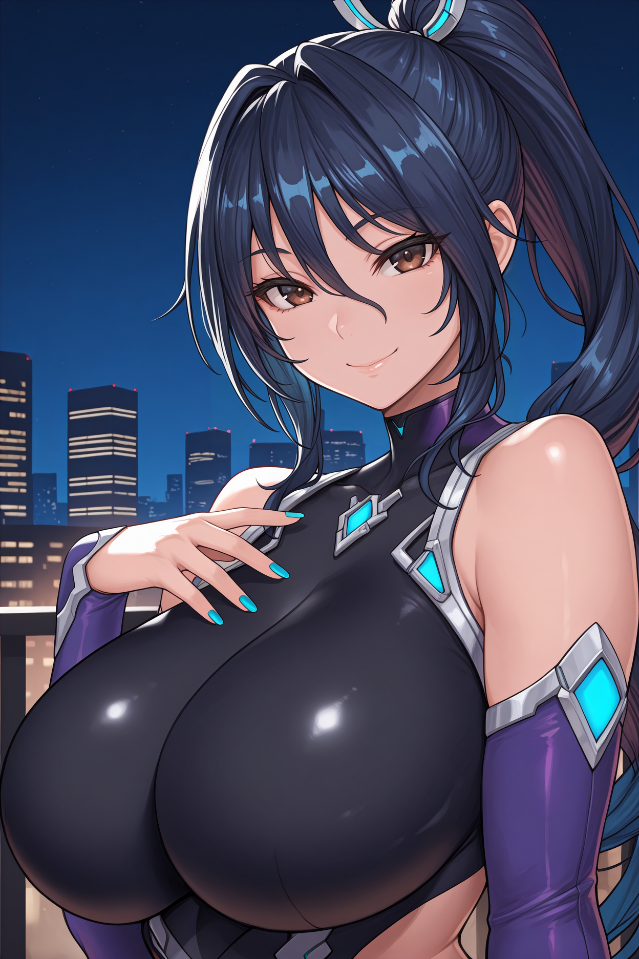 액션 타이마닌 스타일을 원하면 "defrinu, 진한 파란색 머리, 높은 토끼 꼬리, 눈 사이의 머리카락, 매우 긴 머리, 갈색 눈, 파란색 손톱, 머리 띠, 검은 바디수트, 흰색 레오타드, 옷 자르기, 소매 없음, 분리된 소매, 보라색 소매, 보라색 레깅스, 검은 부츠, 하이힐 부츠"를 추가하세요.