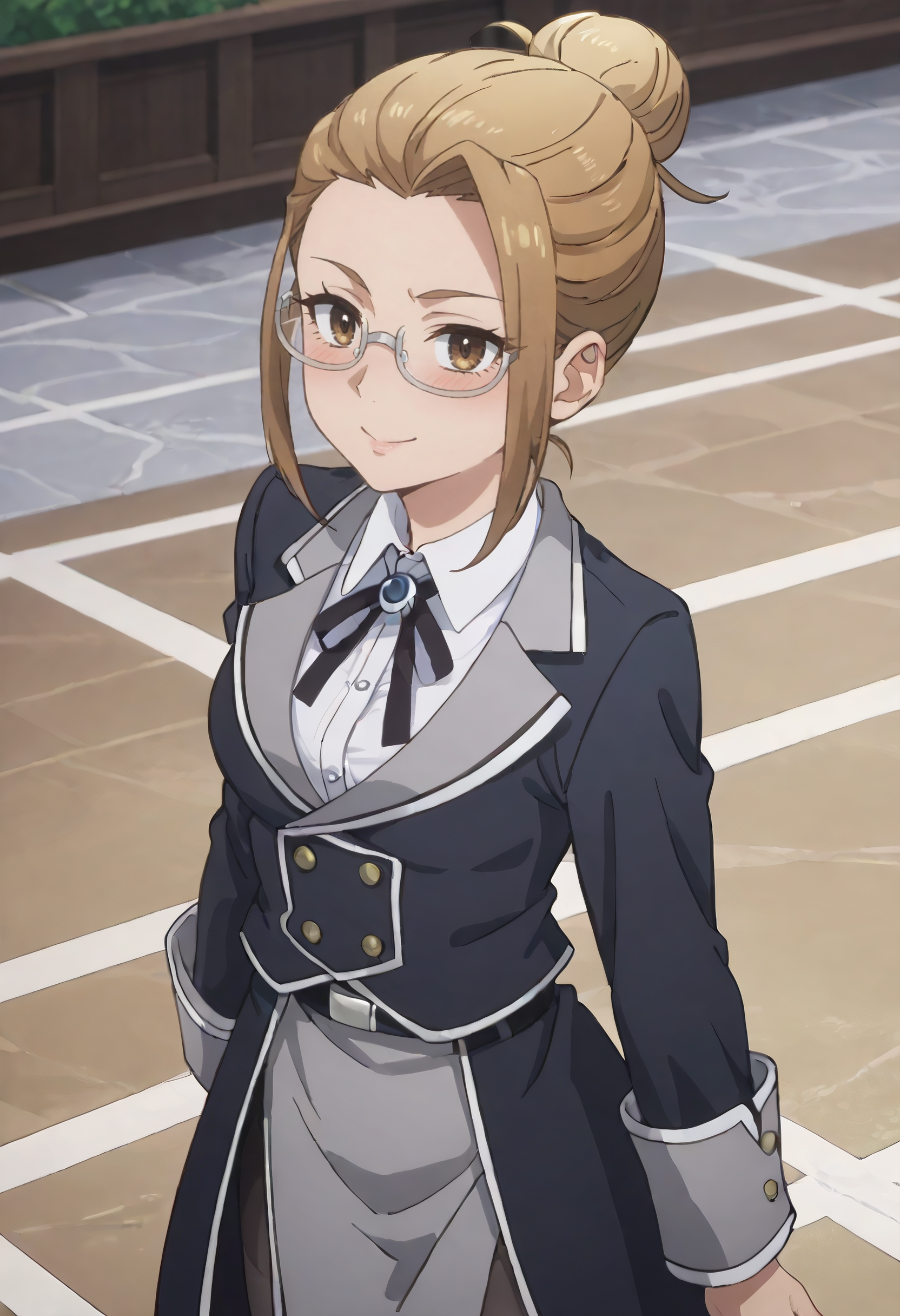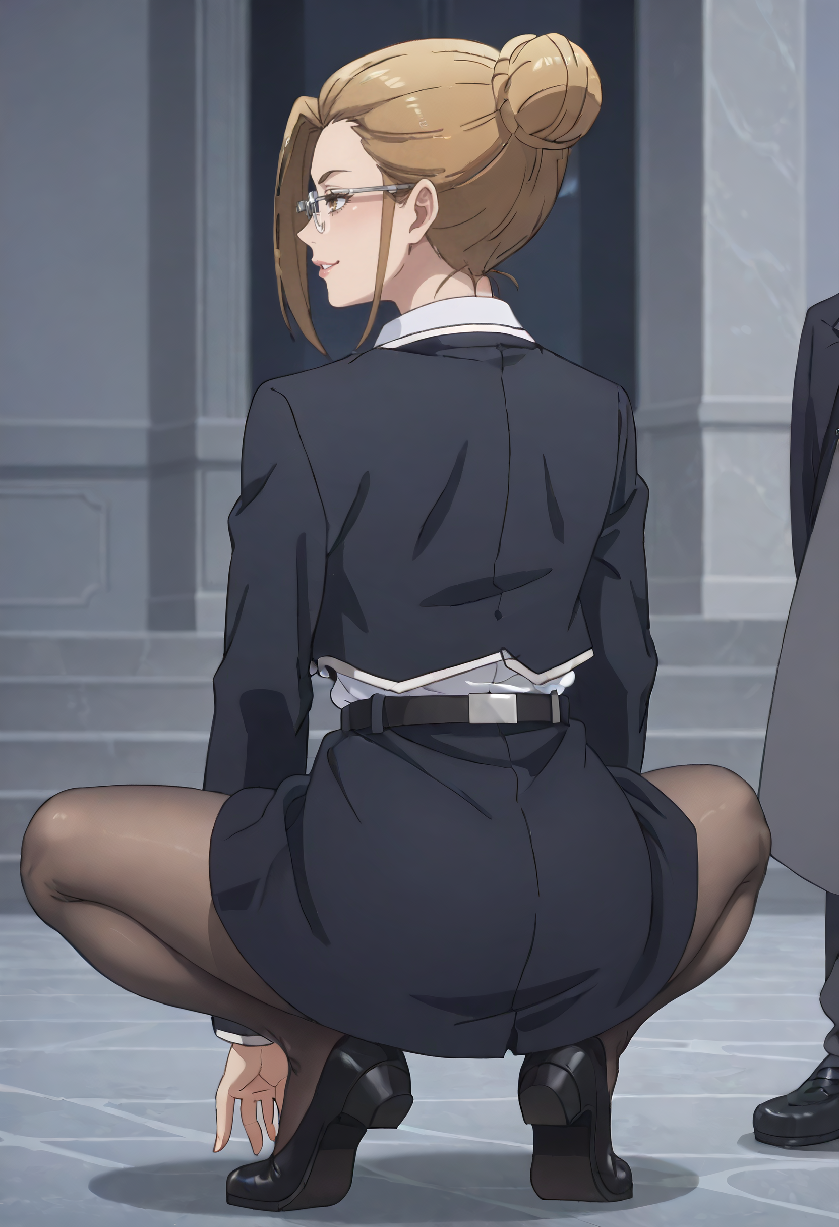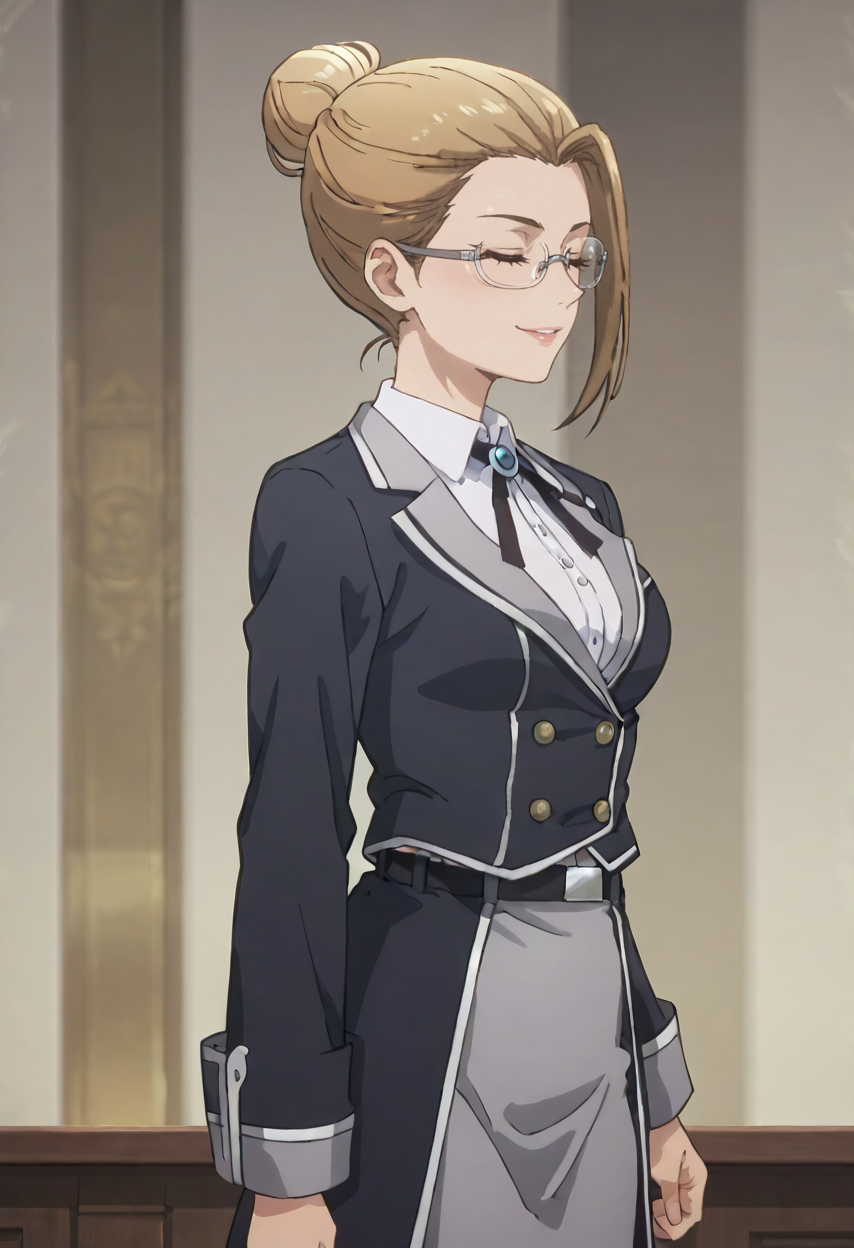 긴 소매, 셔츠, 재킷, 칼라 셔츠, 흰색 셔츠, 치마, 목 끈, 리본, 정식, 검은 재킷, 블레이저, 날개 칼라, 유니폼, 단추, 벨트, 회색 치마, 팬티스타킹, 검은 하의