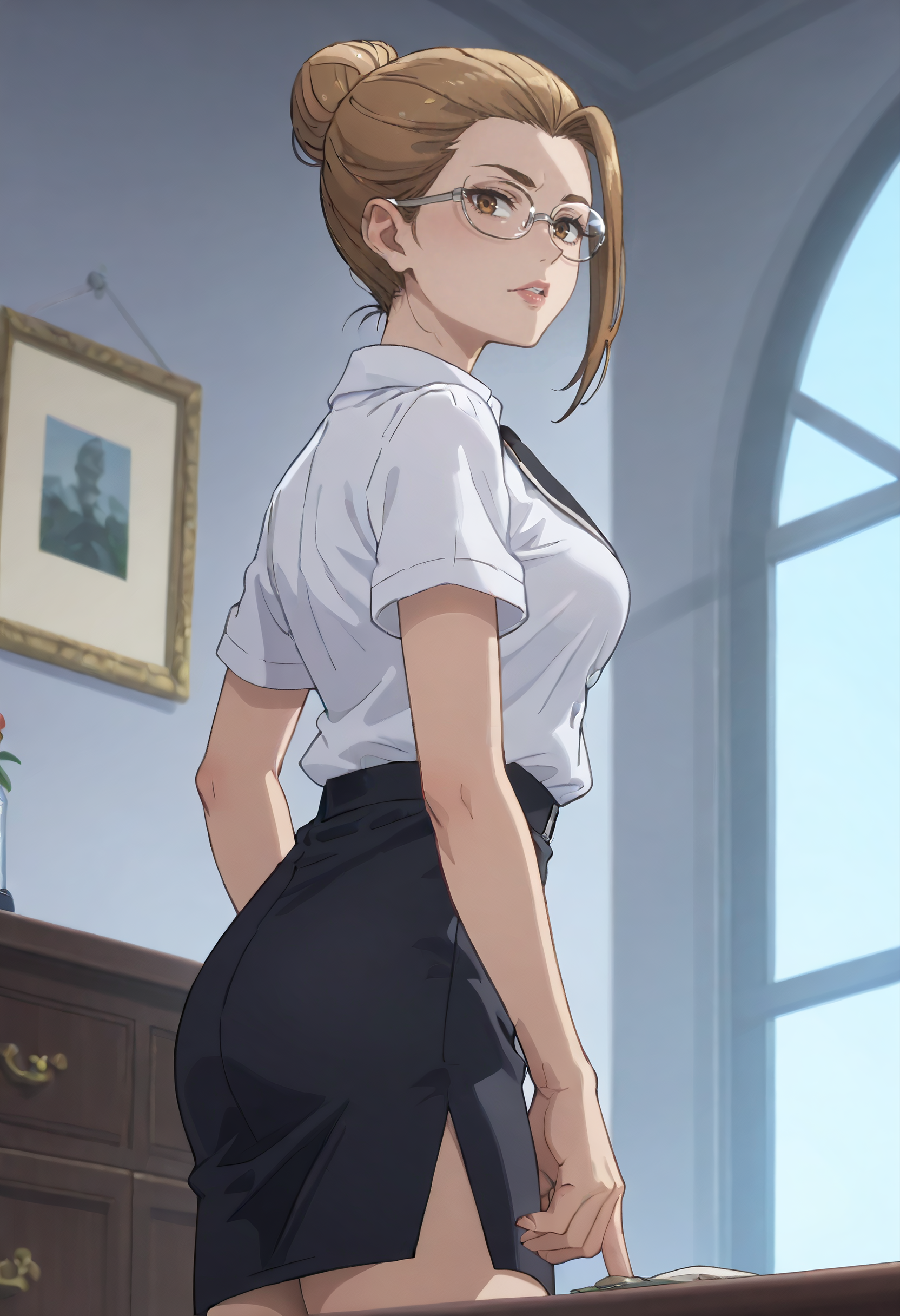 GirFili, 갈색 머리, 단발, 갈색 눈, 안경, 반프레임 안경, 아래프레임 안경, 단일 뾰족 머리결, 머리결