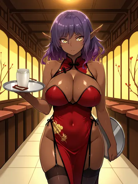 外見:セレデルバ、紫髪、グラデーション髪、長い後ろ髪、黄色い目、尖った耳、肌の濃い女性、大きな胸