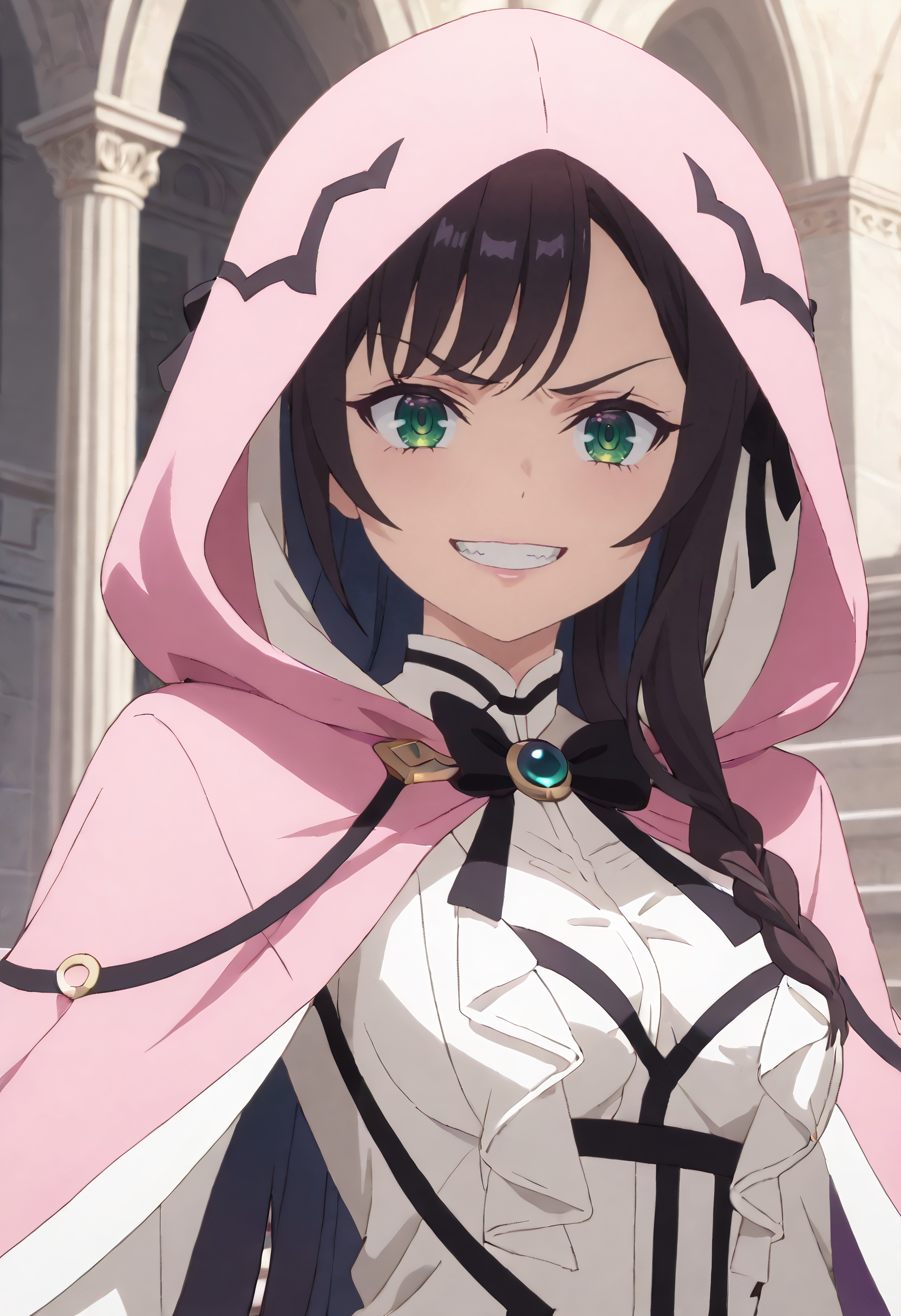 GirAlina、長い髪、黒髪、前髪、緑の目、髪の下に見える眉毛、