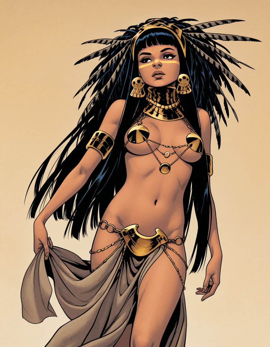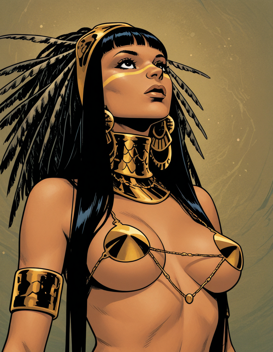 kc_mato, 1girl, black eyes, black hair, long hair, blunt bangs, feathered headdress, gold earrings, face paint, choker, micro_breastplate, armbands, midriff, navel, pelvic curtain