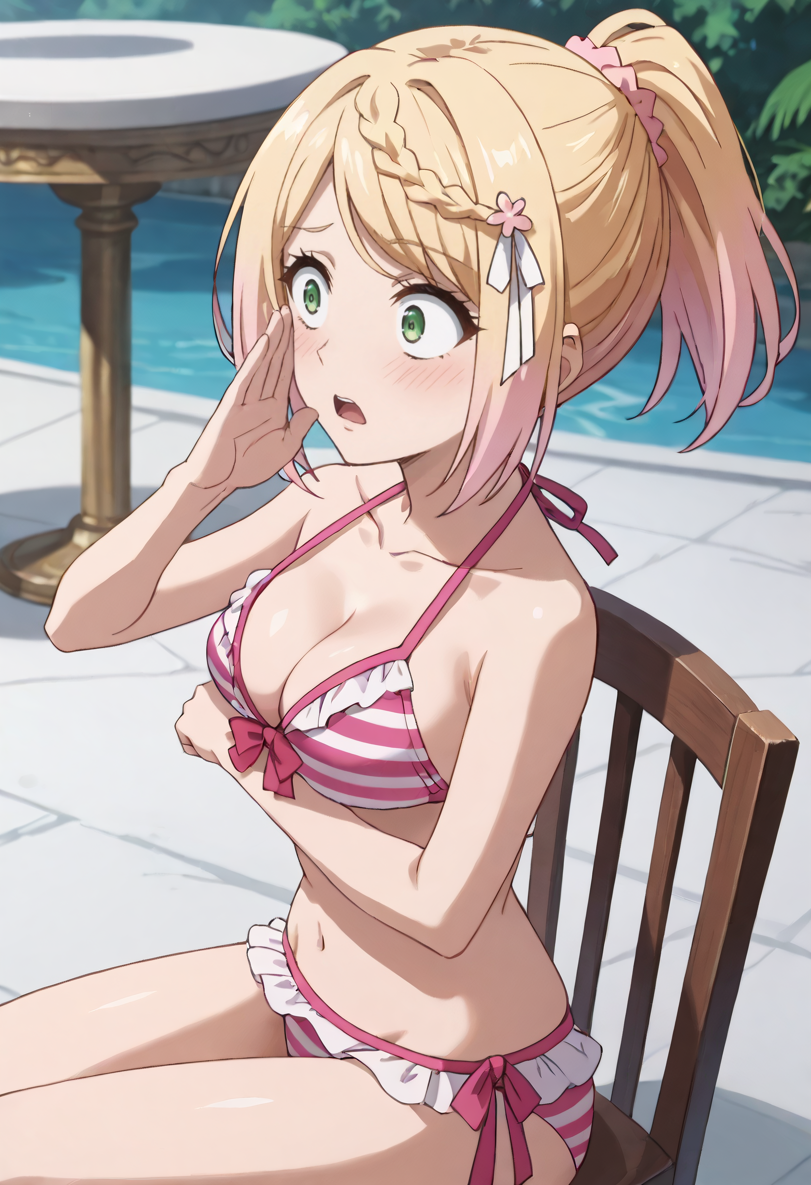 SakuraBikini, 수영복, 비키니, collarbone, 분홍 비키니, 줄무늬, 줄무늬 비키니, 어깨 노출, 배꼽, 포니테일, 가슴 노출, 프릴 비키니, 프릴, 해터넥, 스컨치,