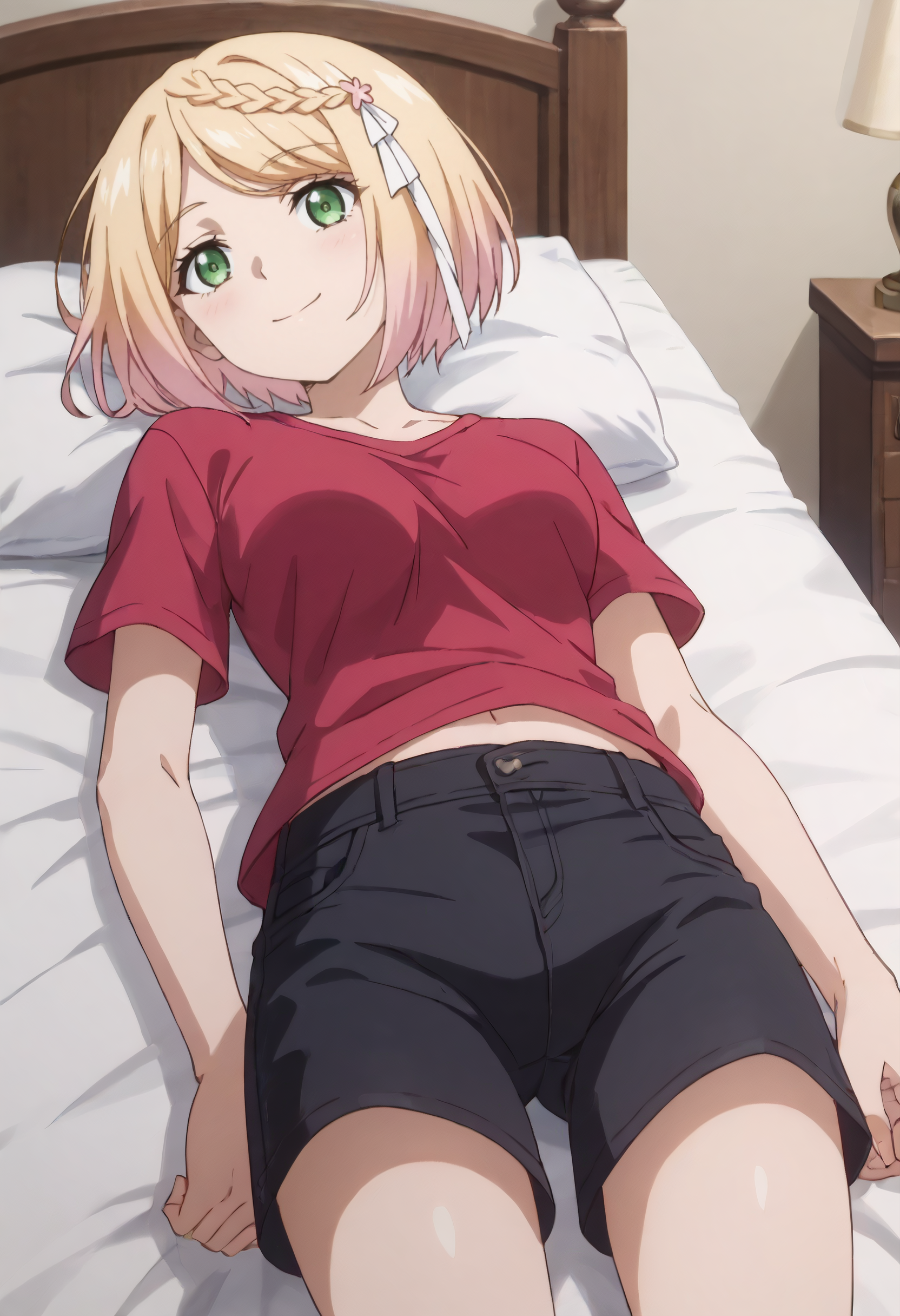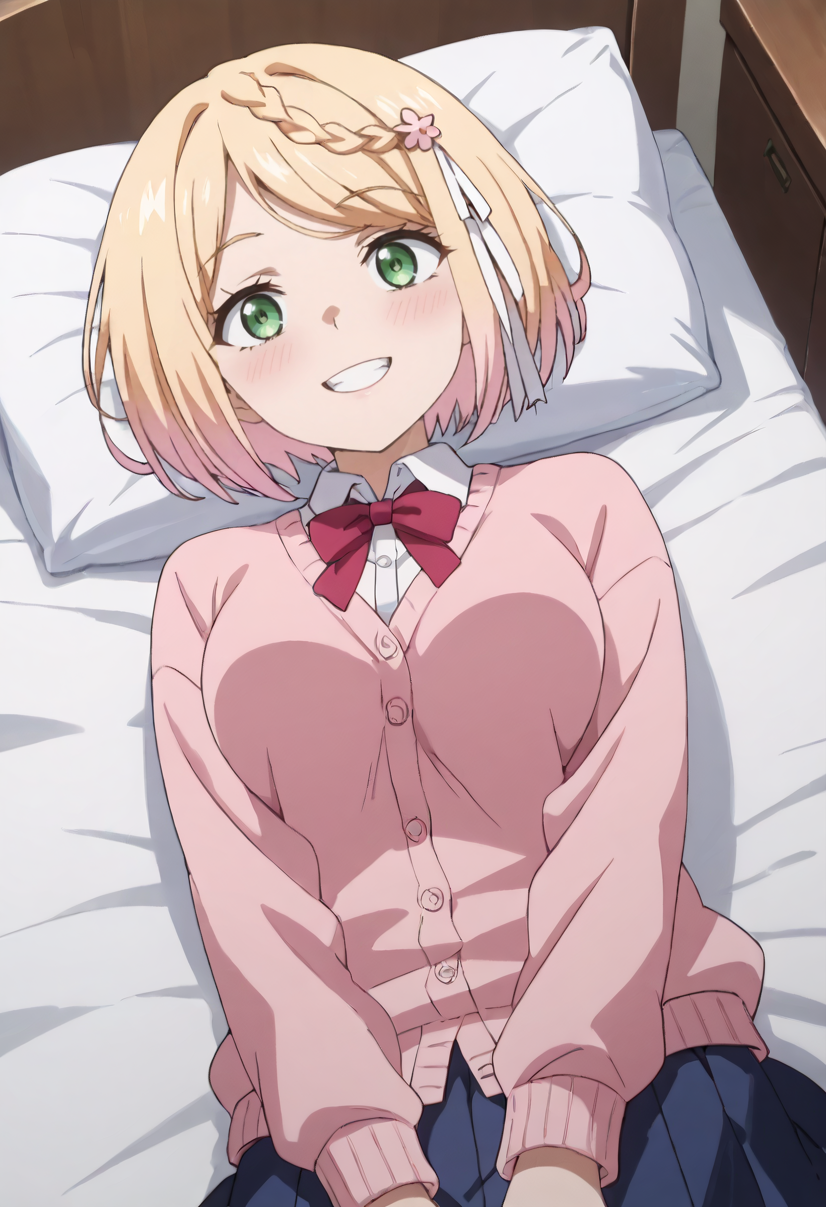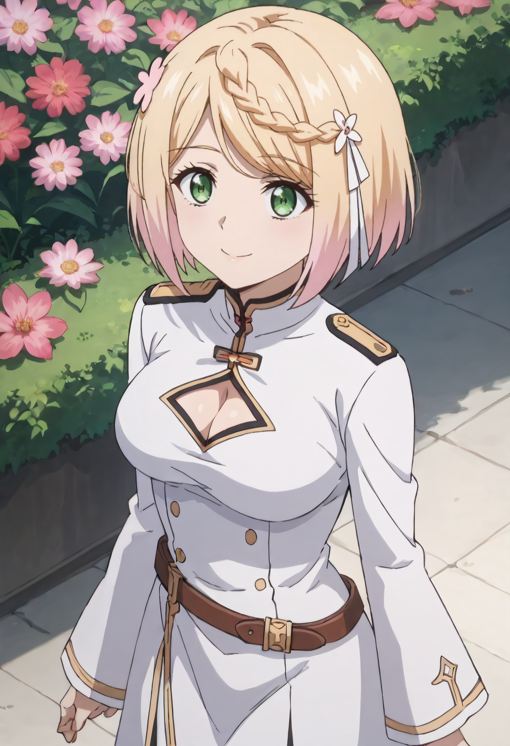 YDESakura, 금발 머리, 단발, 그라데이션 머리, 분홍색 머리, 녹색 눈, 앞머리, 땋은 머리, 머리카락으로 보이는 눈썹, 왕관 땋기, 흐르는 앞머리,