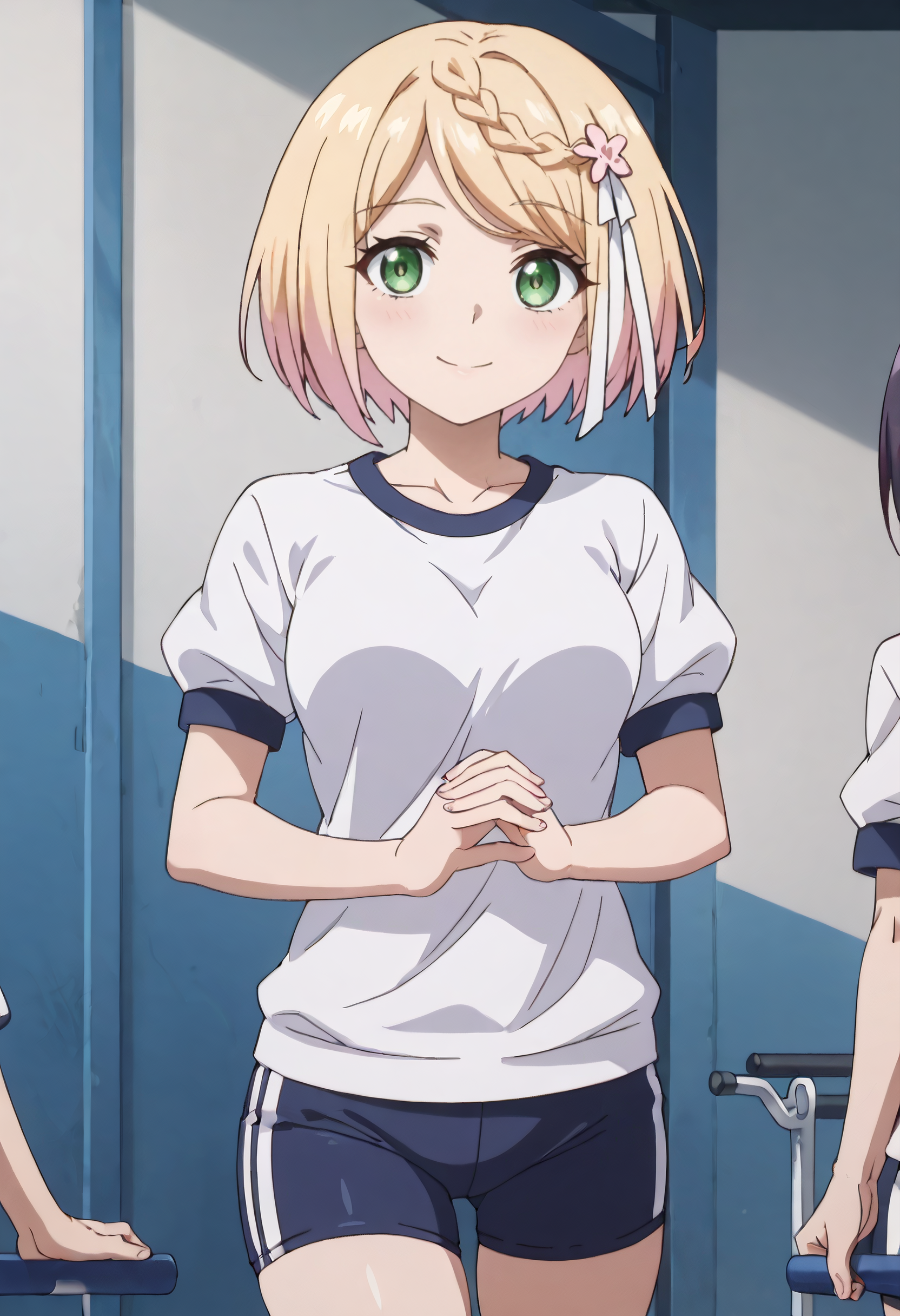 SakuraSport, 셔츠, 흰색 셔츠, 반소매, 머리 장식, 풍성한 반소매, 풍성한 소매, 체육복, collarbone, 체육복 셔츠, 꽃, 머리에 핀 꽃, 자전거 반바지, 짧은 반바지, 체육복 반바지, 파란 반바지,