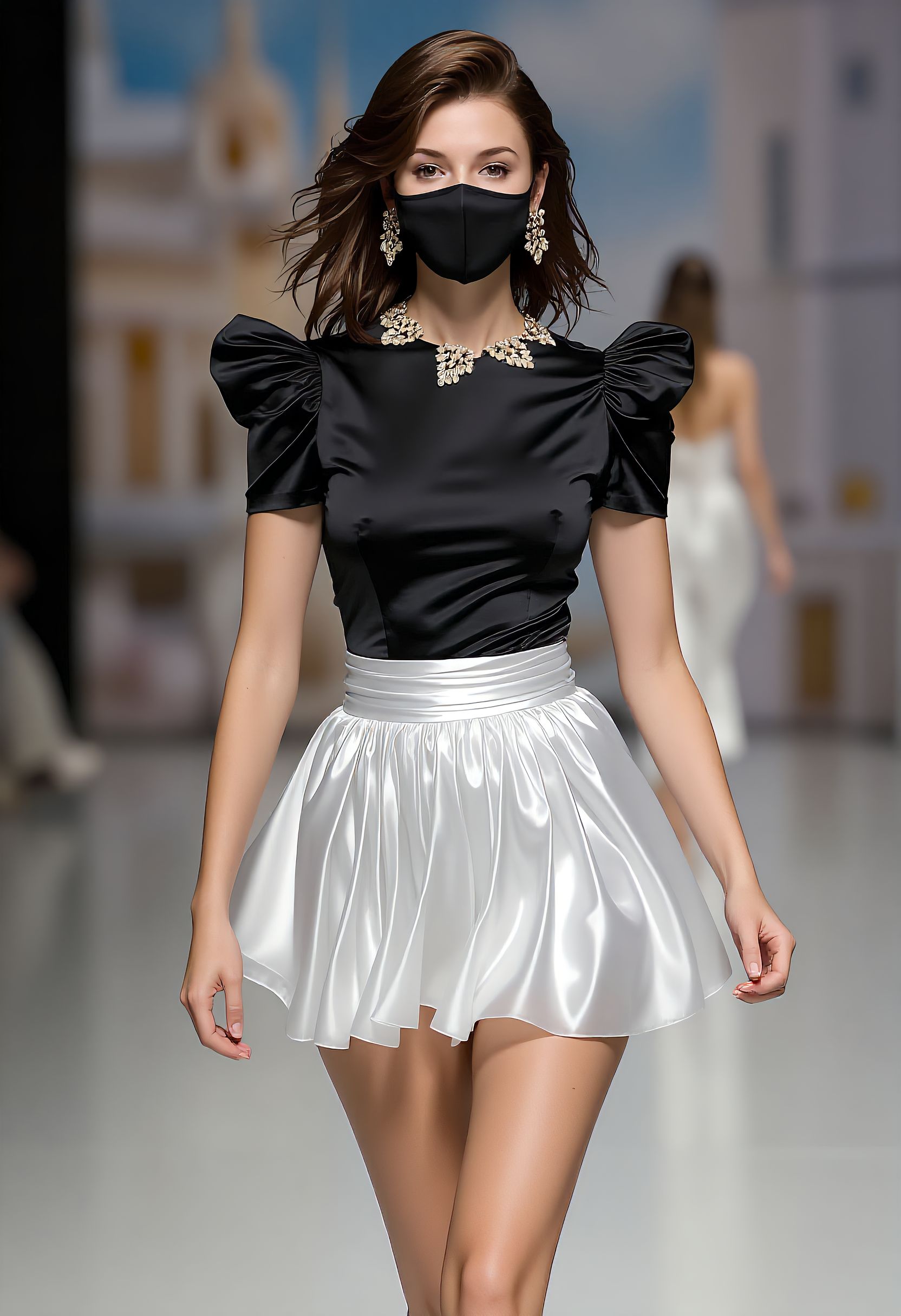 D066_ドレス、ラウンドネックの短めのふわふわTシャツ、黒いシルク生地、白いレースの襟、白いシルクのハイウエストのプリーツ短スカート、フローティングスカート、光沢のある服、滑らかなシルクの質感、
