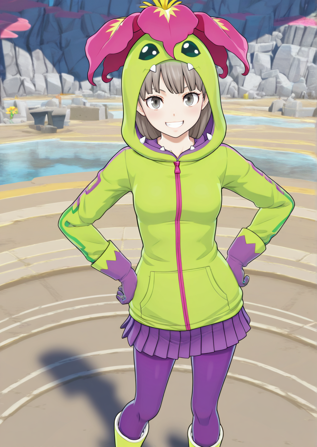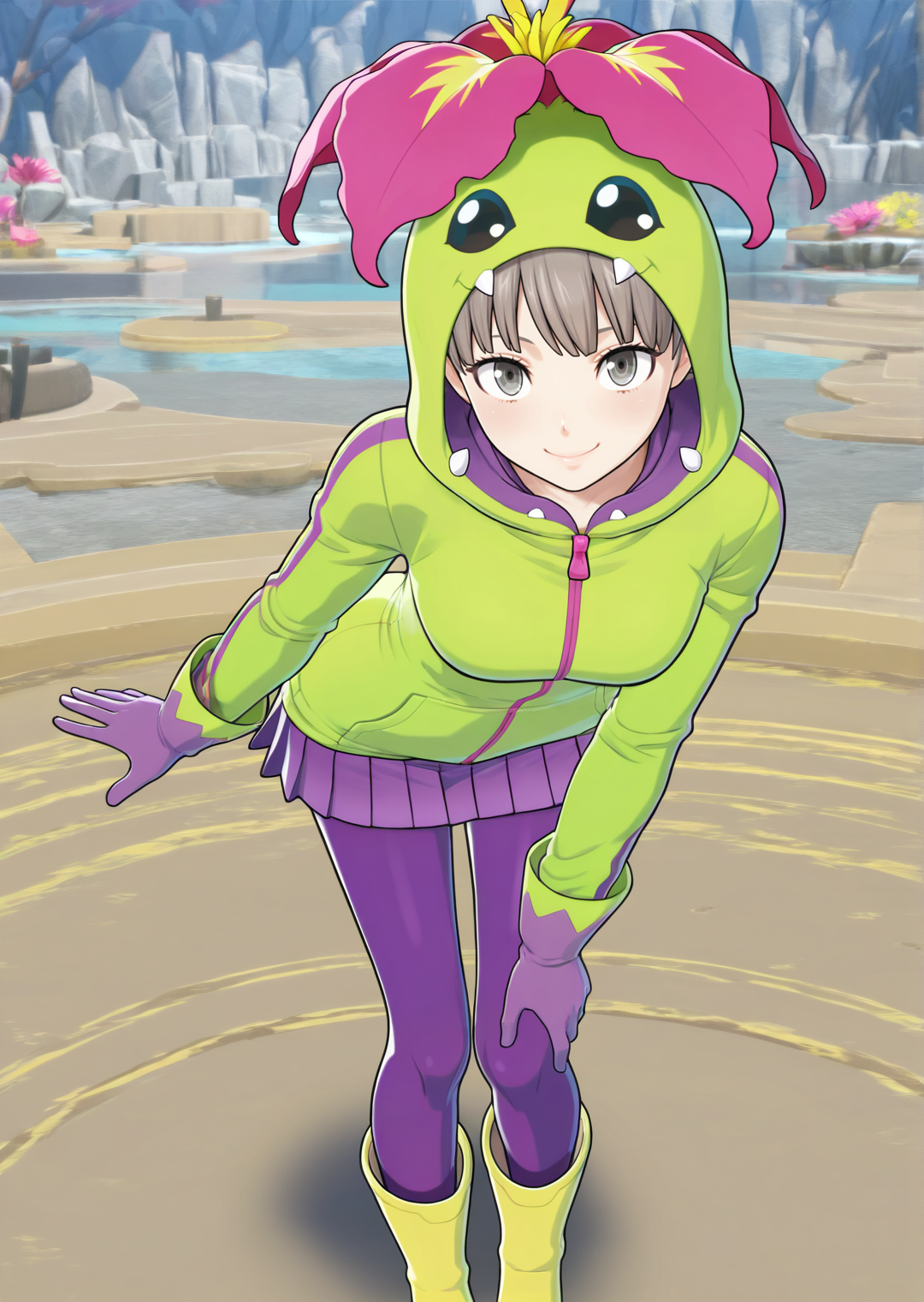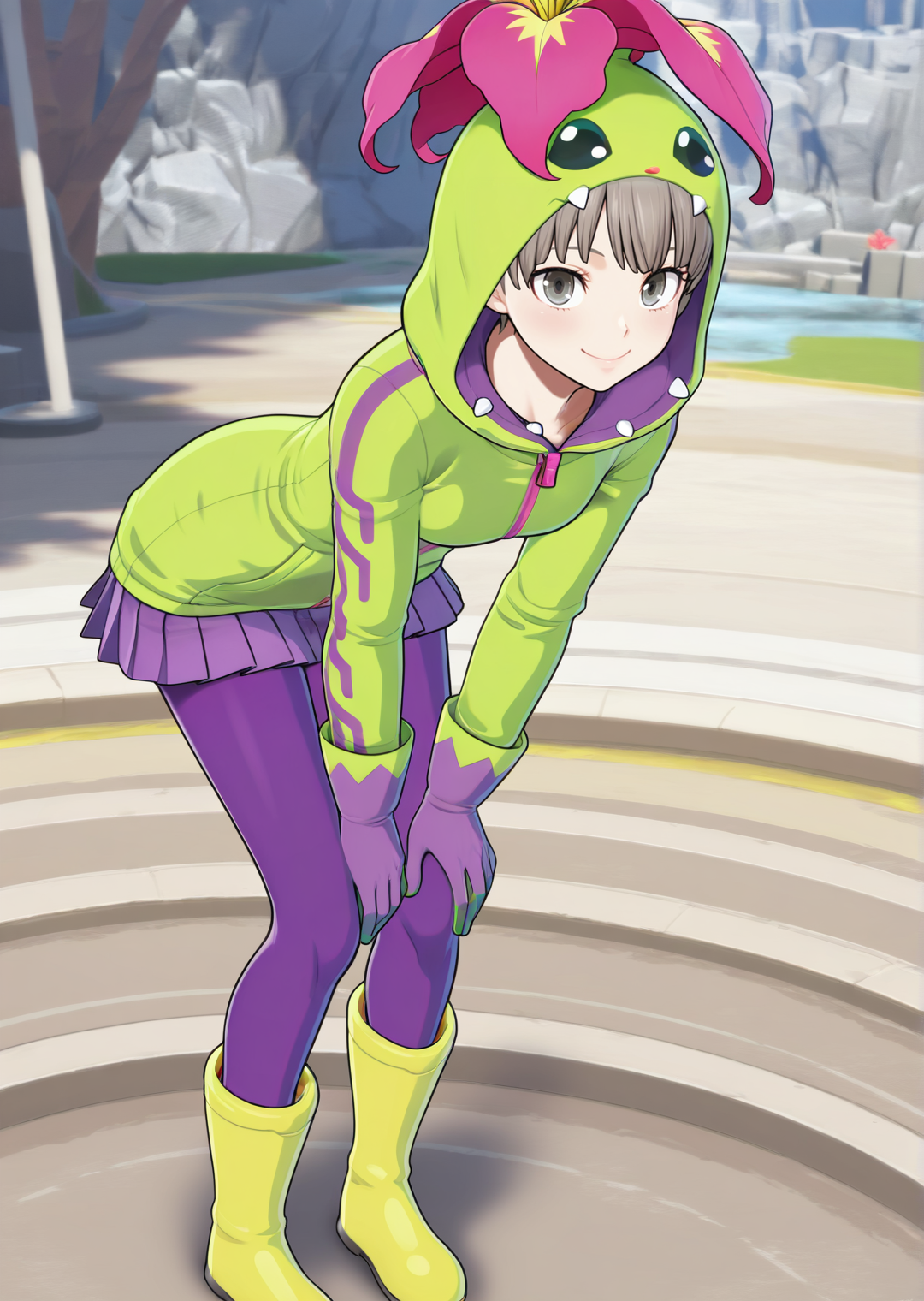 긴 소매, 팬티스타킹, 주름 치마, 미니 스커트, 꽃, 동물 헤드, 후드 재킷, 후드 올림, 지퍼, 보라색 치마, 녹색 재킷, 보라색 장갑, 녹색 신발, 보라색 팬티스타킹, 고무 부츠, 녹색 후드