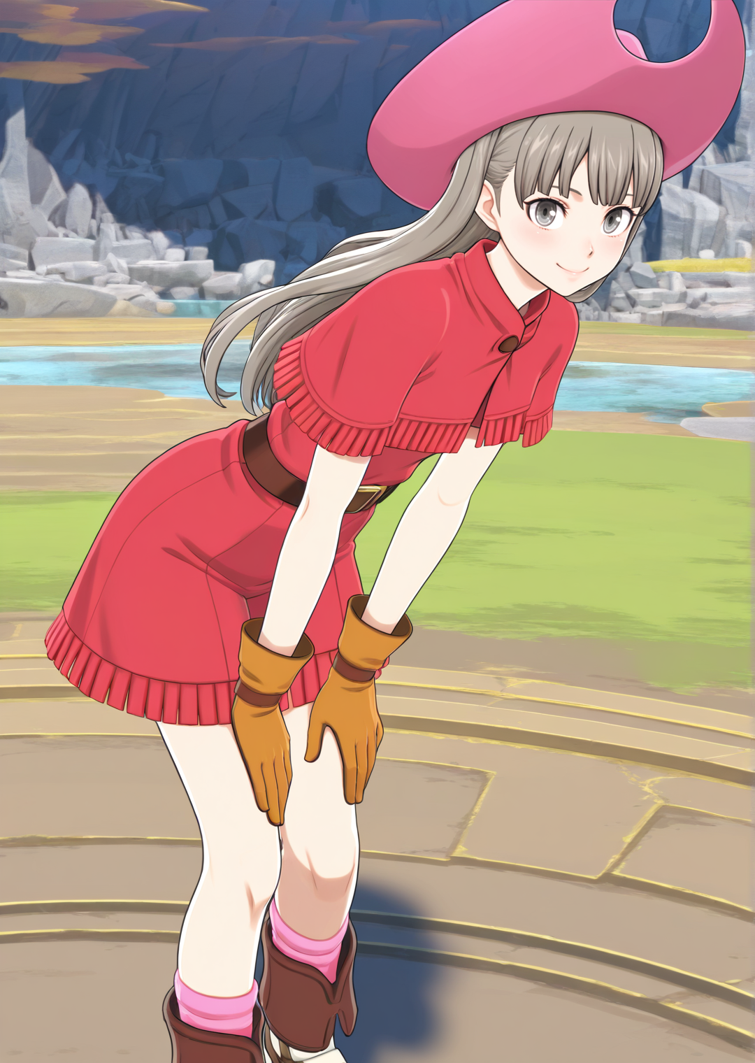 짧은 소매, 캐프레트, 갈색 신발, 흰색 신발, 빨간 드레스, 갈색 장갑, 갈색 벨트, 분홍색 머리장식, 프린지 트림, 카우보이 모자, 주황색 장갑, 분홍색 양말, 카우보이 부츠, 짧은 드레스, 검은 벨트, 벨트 버클