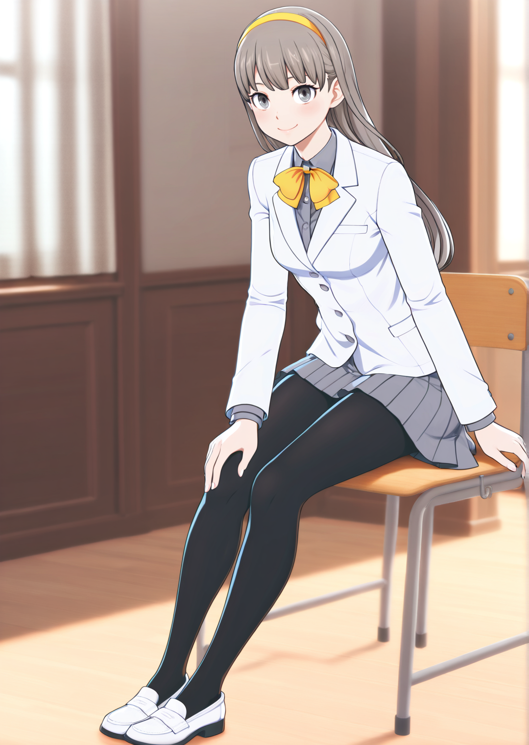 학교 유니폼, 노란색 넥타이, 노란색 헤어밴드, 흰색 블레이저, 회색 치마, 검은색 팬티스타킹, 신발