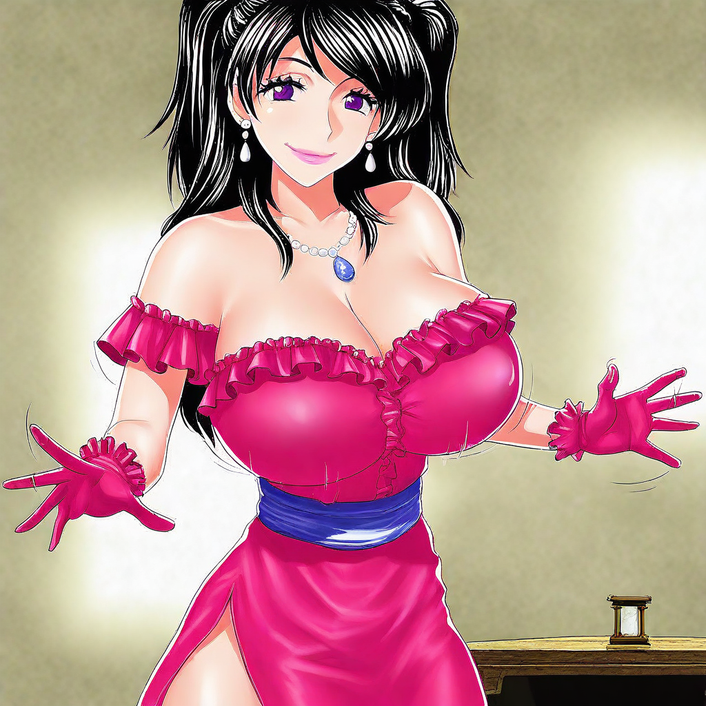 1. ((숄더를 드러낸 스트랩 없는 프릴 드레스, 거대한 가슴선, 사이드 슬릿, 프릴 장갑, 보석, 펜던트 목걸이, 진주 귀걸이))