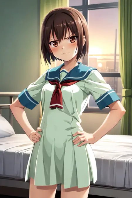 brown hair, brown eyes, sailor dress, short sleeves, neckerchief, white socks, loafers, brown footwear