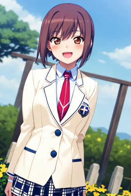 brown hair, brown eyes, school uniform, blazer, long sleeves, necktie, plaid skirt