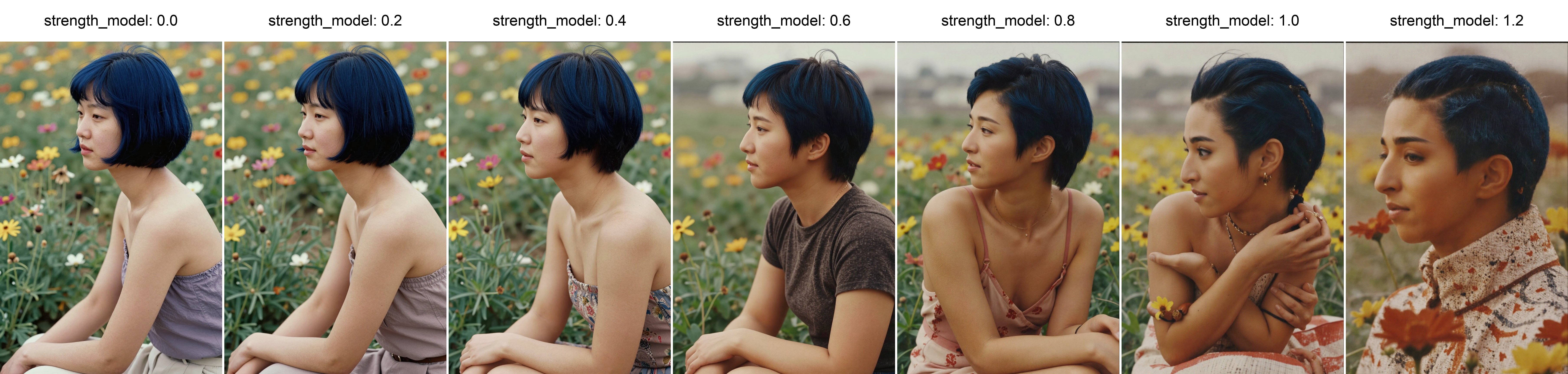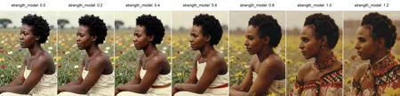 该LORA在多种族裔上表现惊人地好,但需要不同的LORA强度(见图)。最佳多样性出现在低强度(0.5-0.7)时;强度高于1时,则会生成平均脸型但鼻子较长的女性。