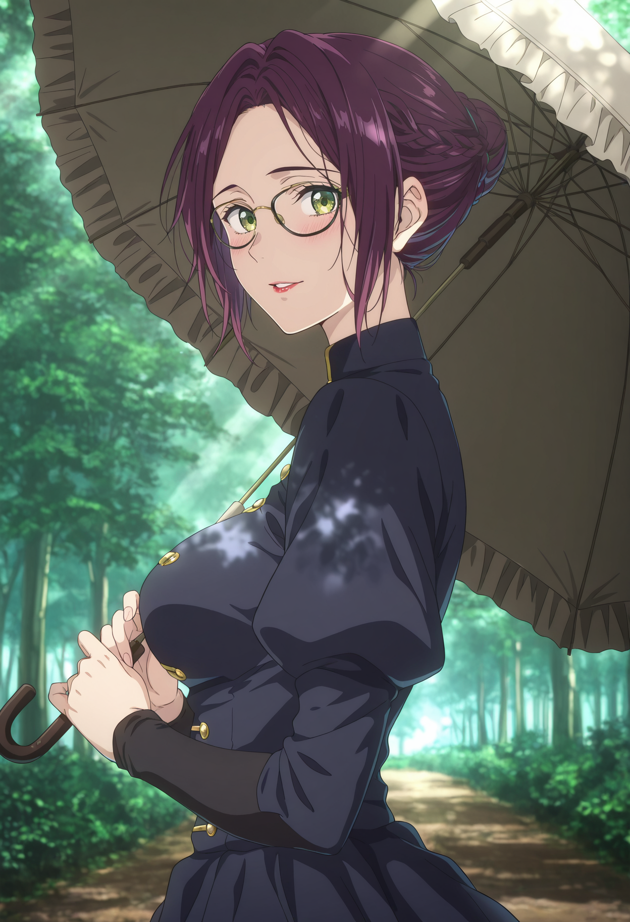 KJOisabella, purple hair, green eyes, parted bangs, hair bun, braid, red lower lips, black framed eyewear,