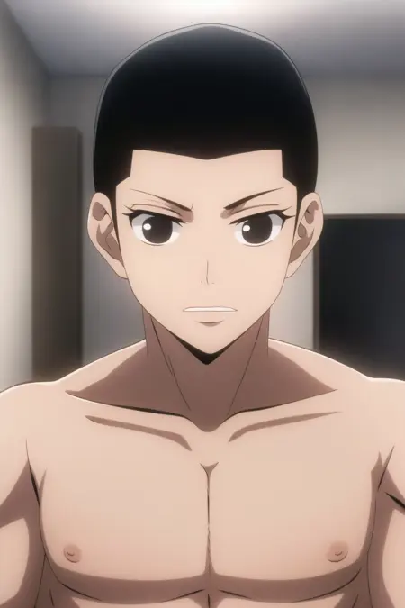 TouichirouIzumida is the trigger word and you can his three hair cuts: shaved hair, spiky hair or short hair with topknot.