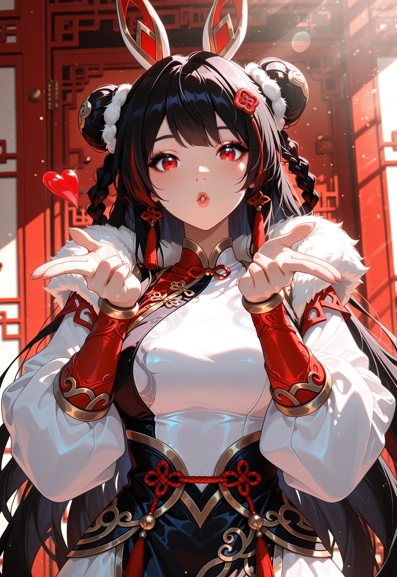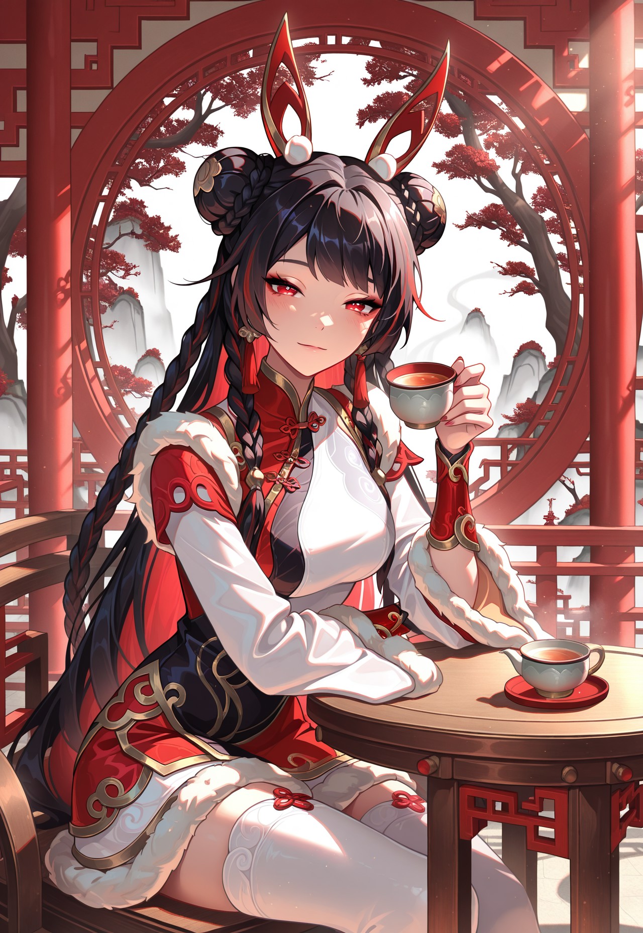MMKseraphine, black hair, braids, long hair, double bun, hair ornament, red eyes, chinese dress, long sleeves, red bracers, white and red top, white and red dress, multicolored dress, fur trim, thighhigh,