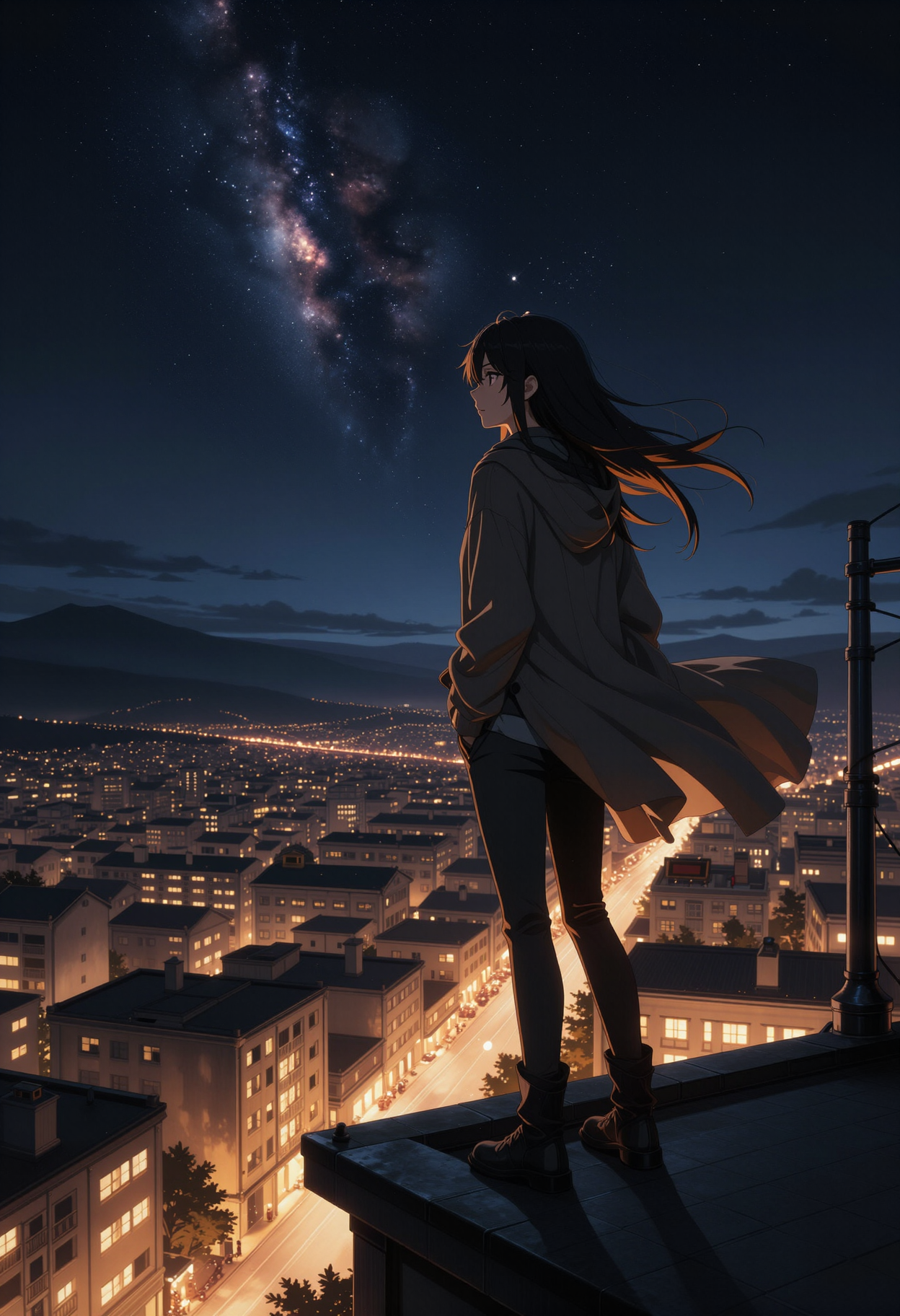 바람이 그의 머리카락과 옷을 부드럽게 흔들고 있음. 사색적인 분위기, 아름다운 도시 야경, 영화적인 애니메이션 구성.