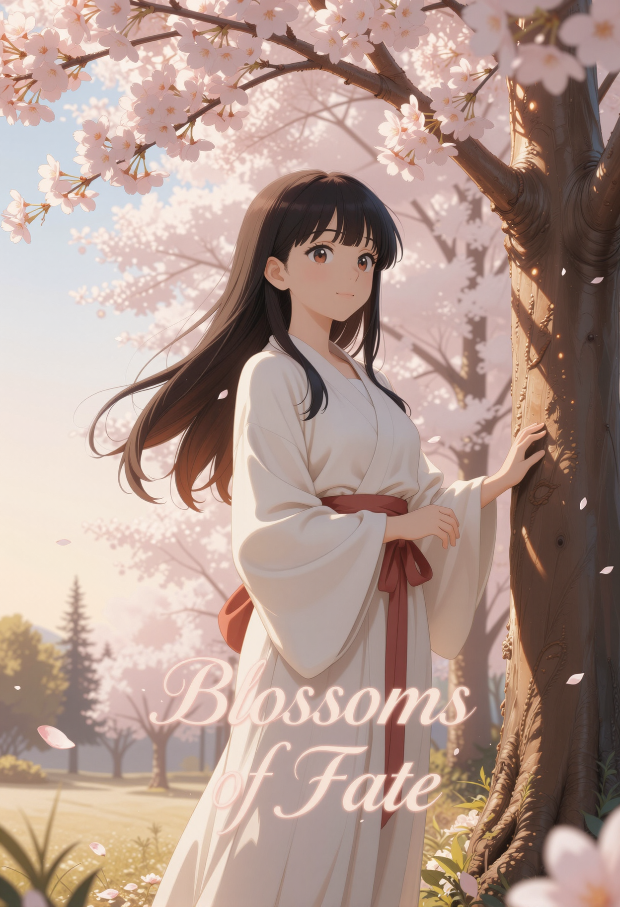 주변에는 벚꽃잎이 떨어지고 있습니다. 옆에서 부드럽게 비치는 골든 아워 조명이 얼굴에 따뜻한 하이라이트를 만듭니다.