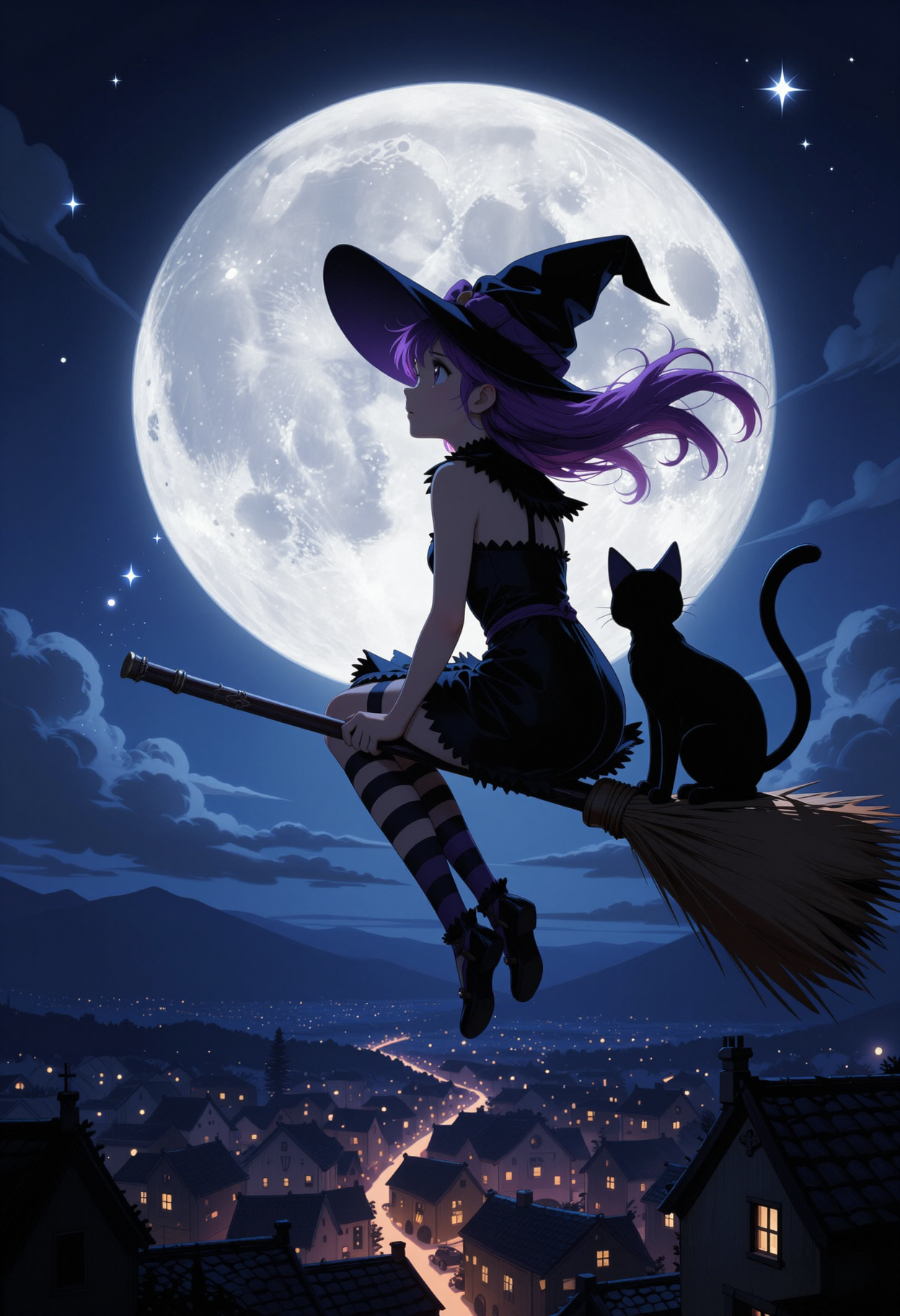 밤에 지붕 위에 혼자 서 있는 애니메이션 인물, 아래 도시의 불빛이 반짝이고, 위로 별이 빛나며,