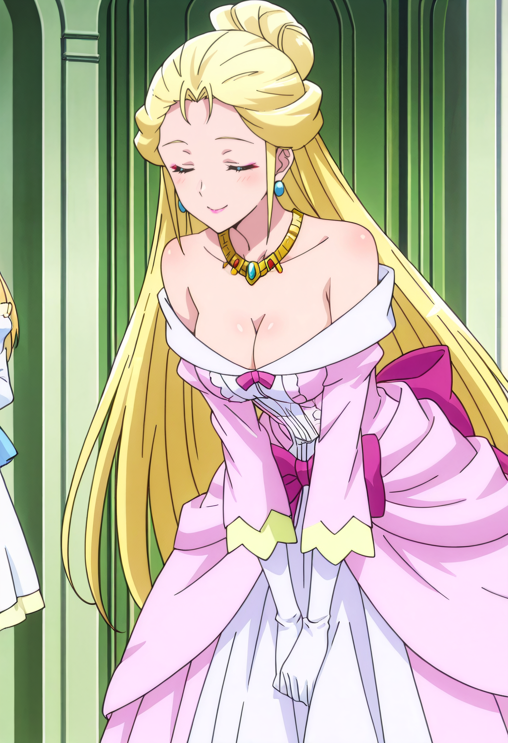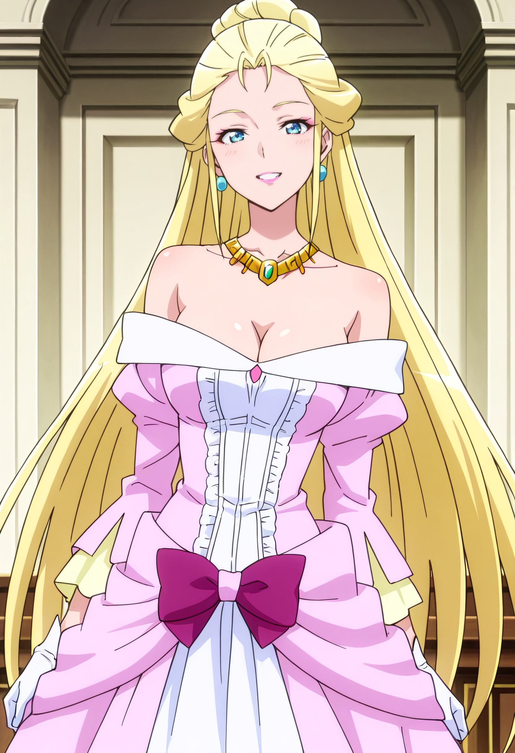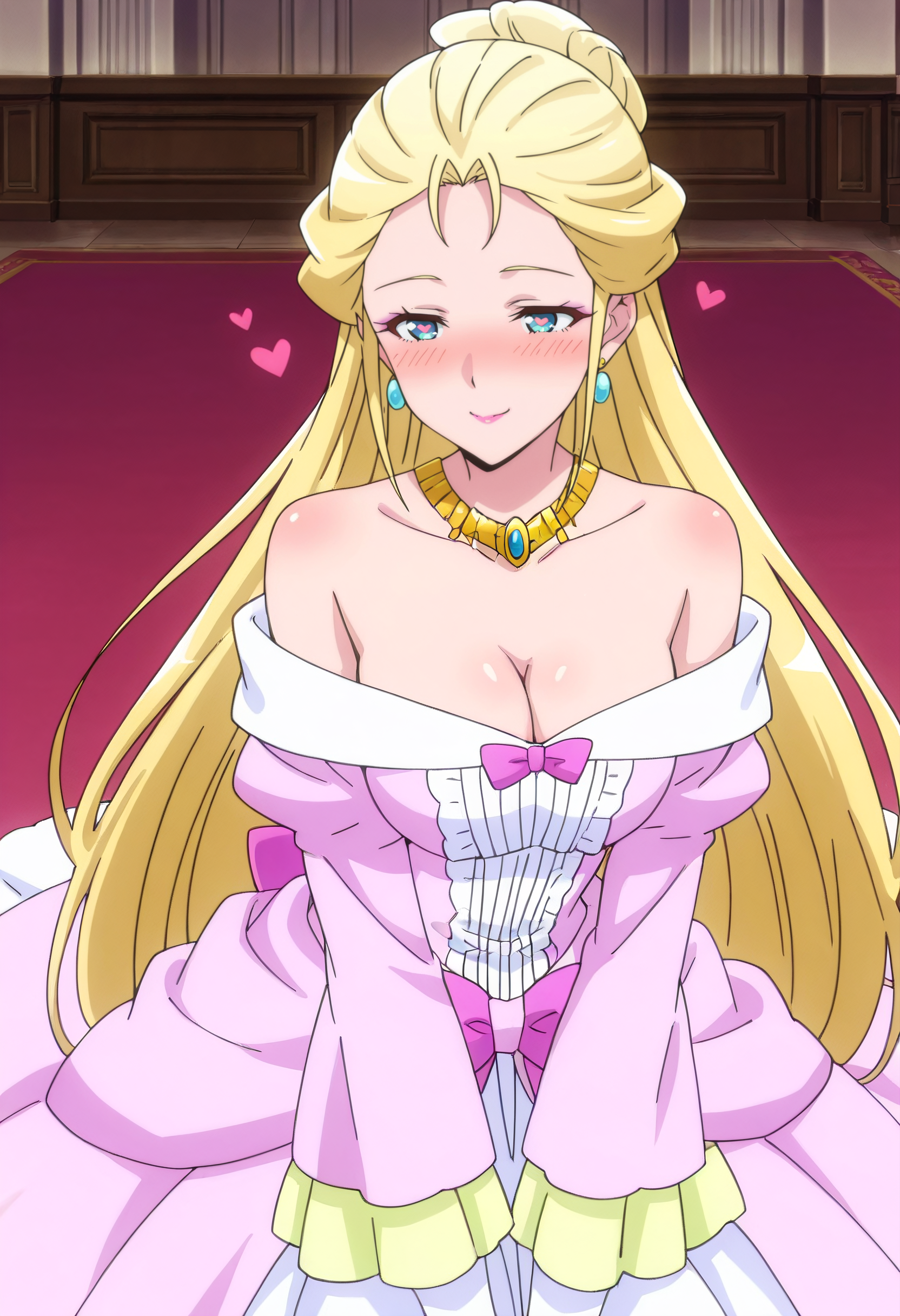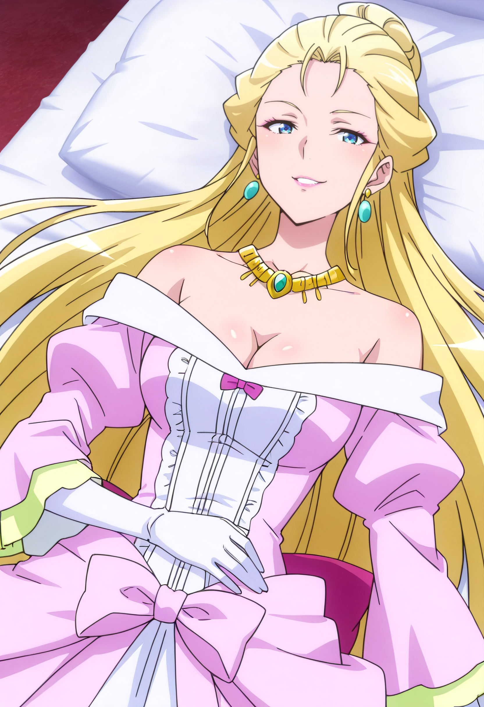YuelOutfit, 보석, 어깨 노출, 드레스, 목걸이, 가슴 노출, 귀걸이, 어깨 드레스, 핑크 드레스, 스트랩리스 드레스, 잠금뼈, 공주, 가운, 스트랩리스, 리본, 흰 장갑, 긴 드레스, 장갑, 긴 소매,
