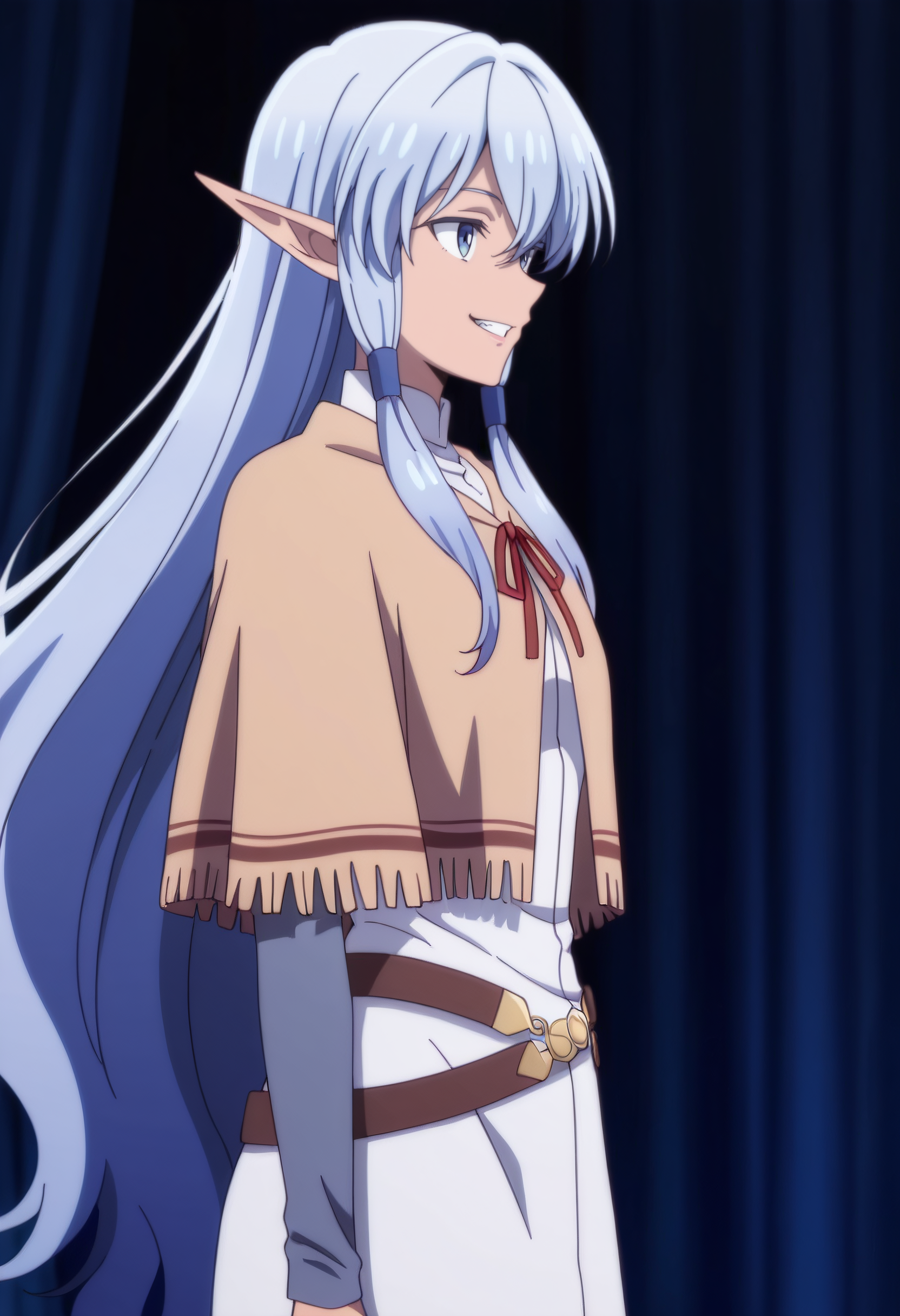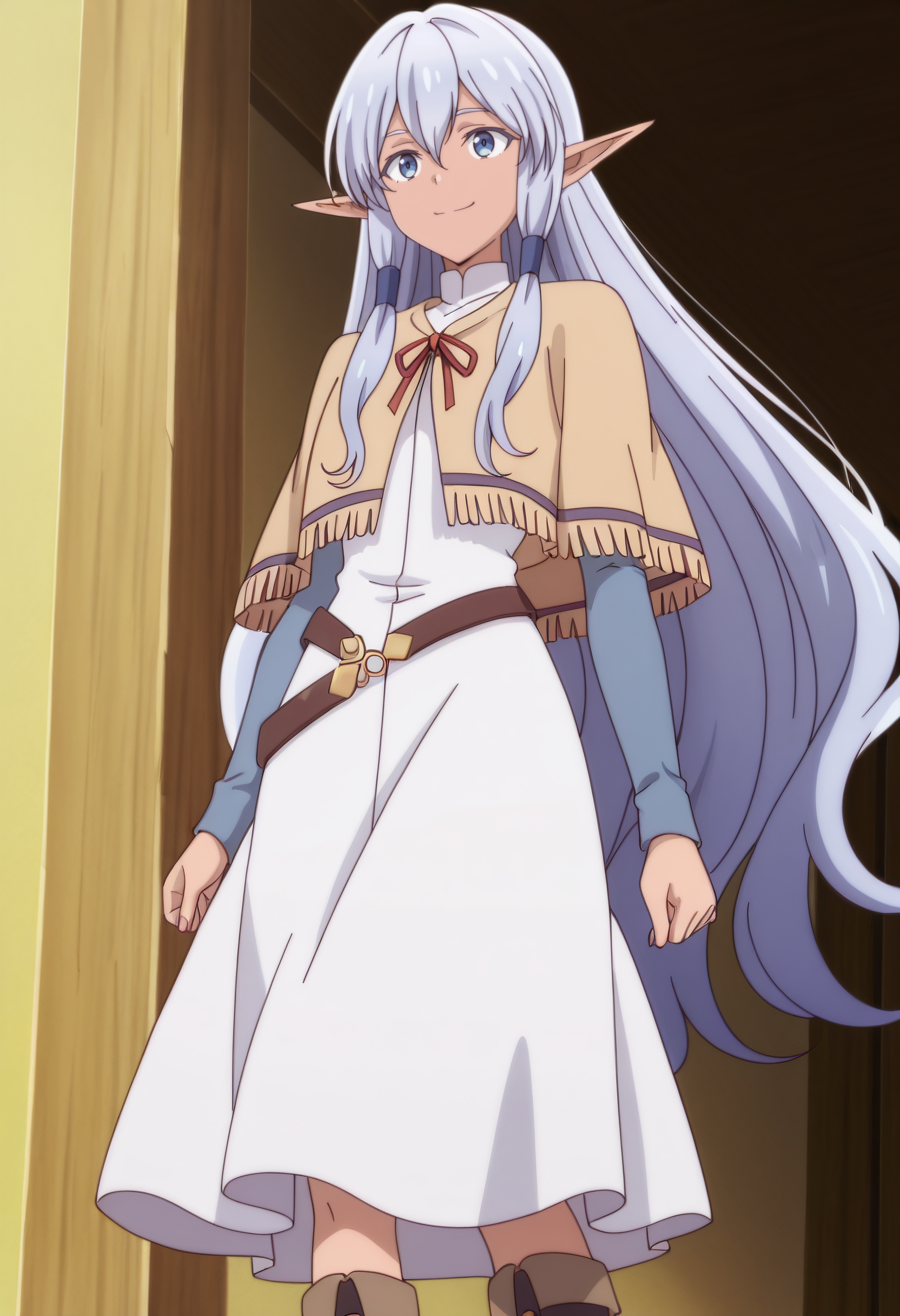 MariaPoncho, 카프레트, 머리 튜브, 긴 소매, 리본, 샬, 드레스, 폰초, 흰색 셔츠, 셔츠, 갈색 신발, 빨간 리본, 갈색 벨트, 갈색 카프레트, 흰색 드레스, 긴 드레스,