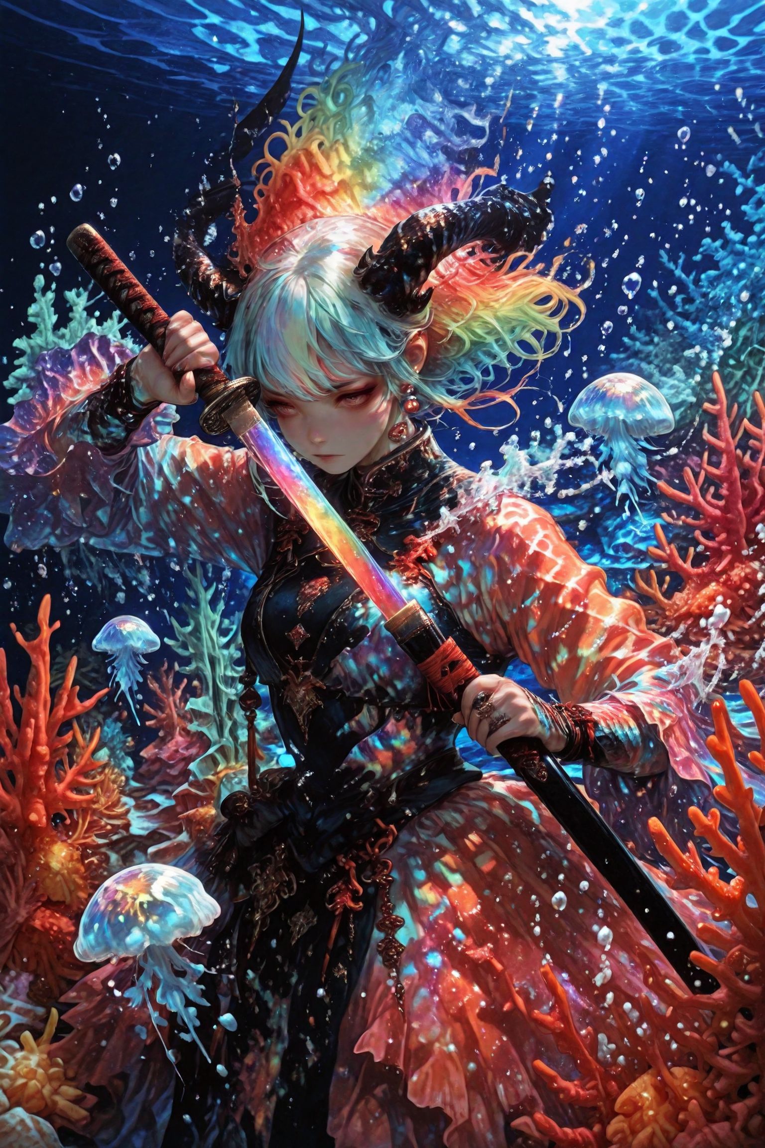 "v3r0x_1th, abstract, surreal, colorful, frederica bernkastel, 1girl, solo, extra eyes, unsheathing katana, purple glowing katana, expressionless, teeth, grin, bug, butterfly, soft shadow, light rays, light particles, dutch angle, portrait, chiaroscuro, dim lighting,"