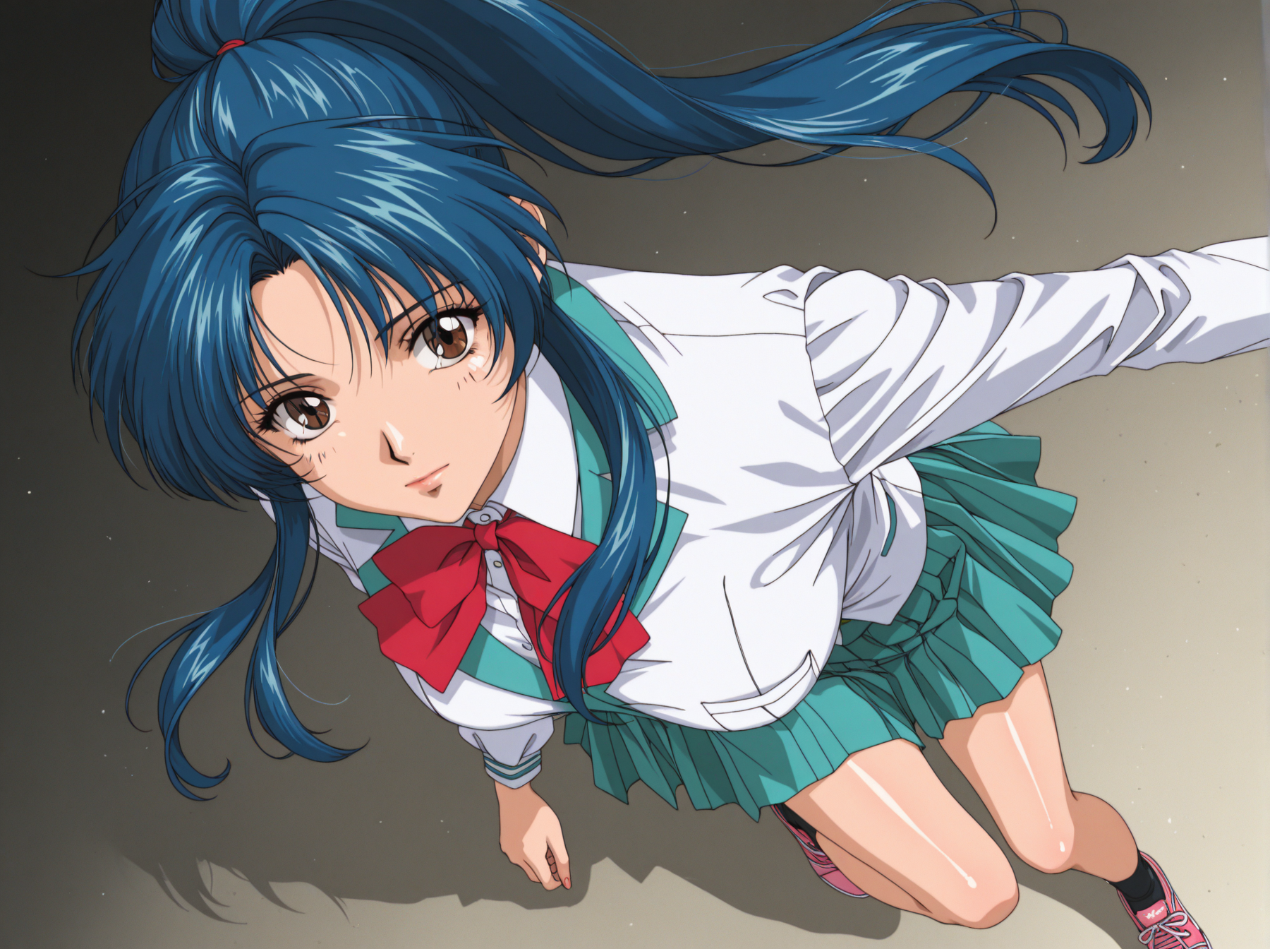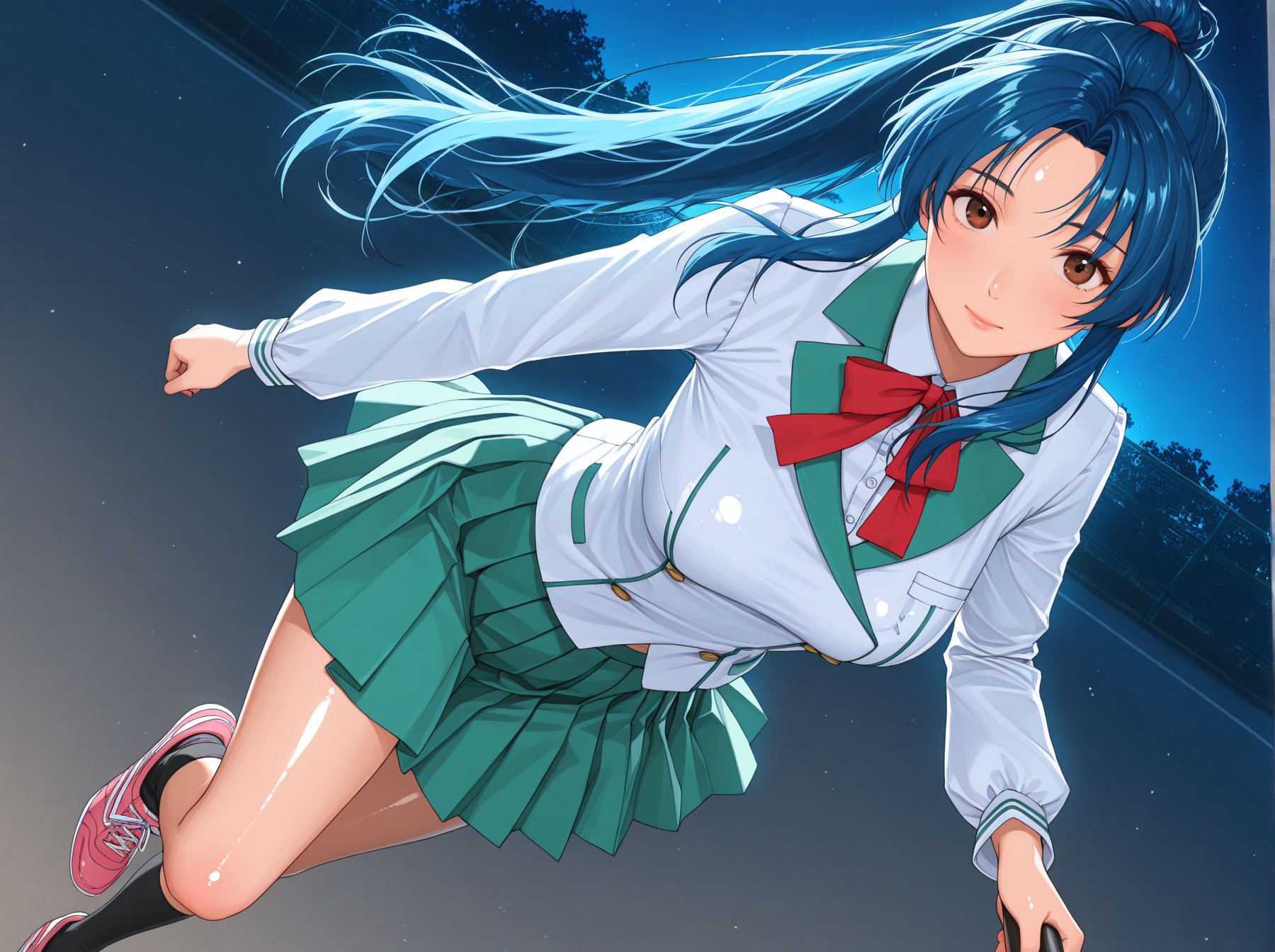 옷: (학교 유니폼, 긴 소매 블라우스, 녹색 치마, 검은 양말, 분홍 테니스 신발)