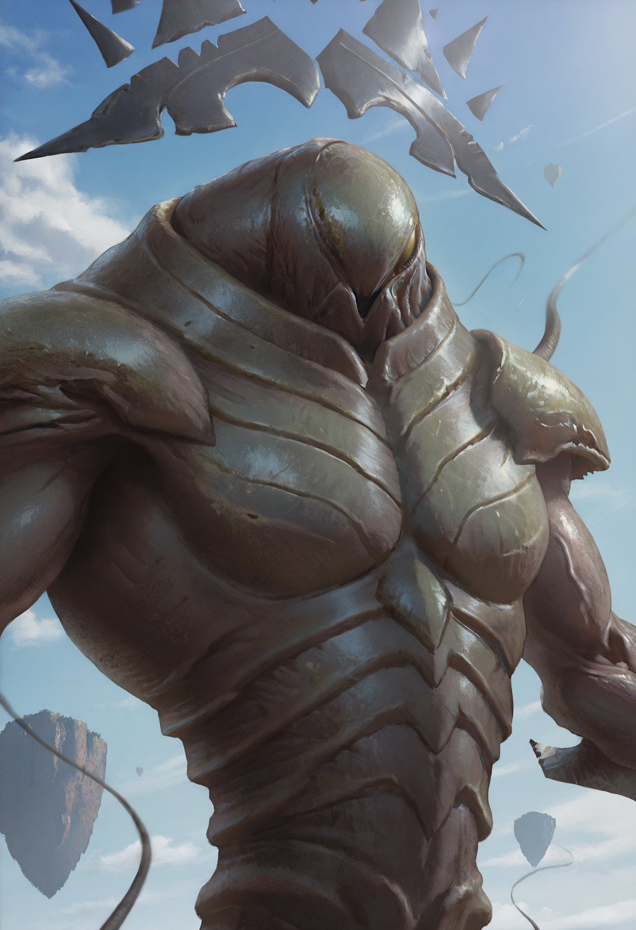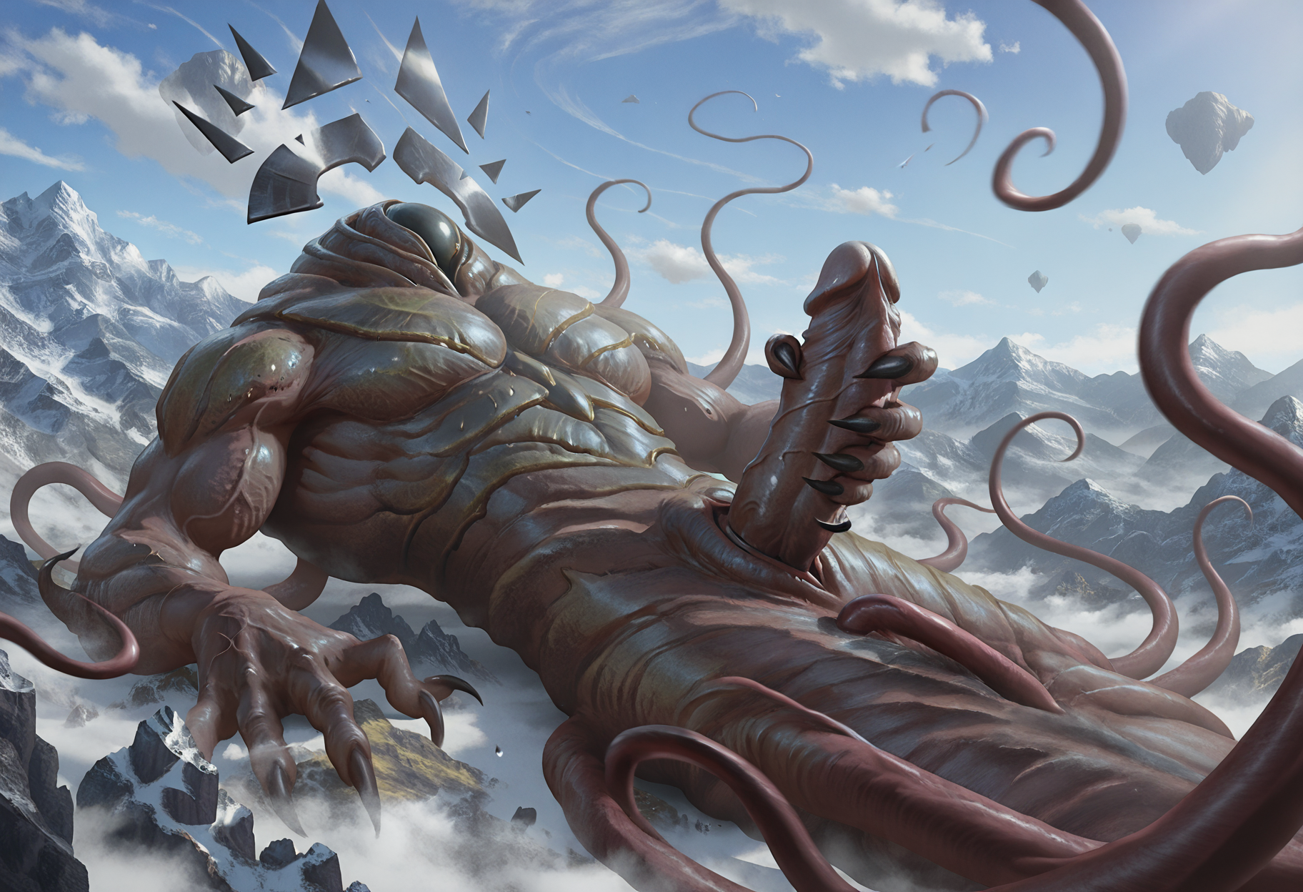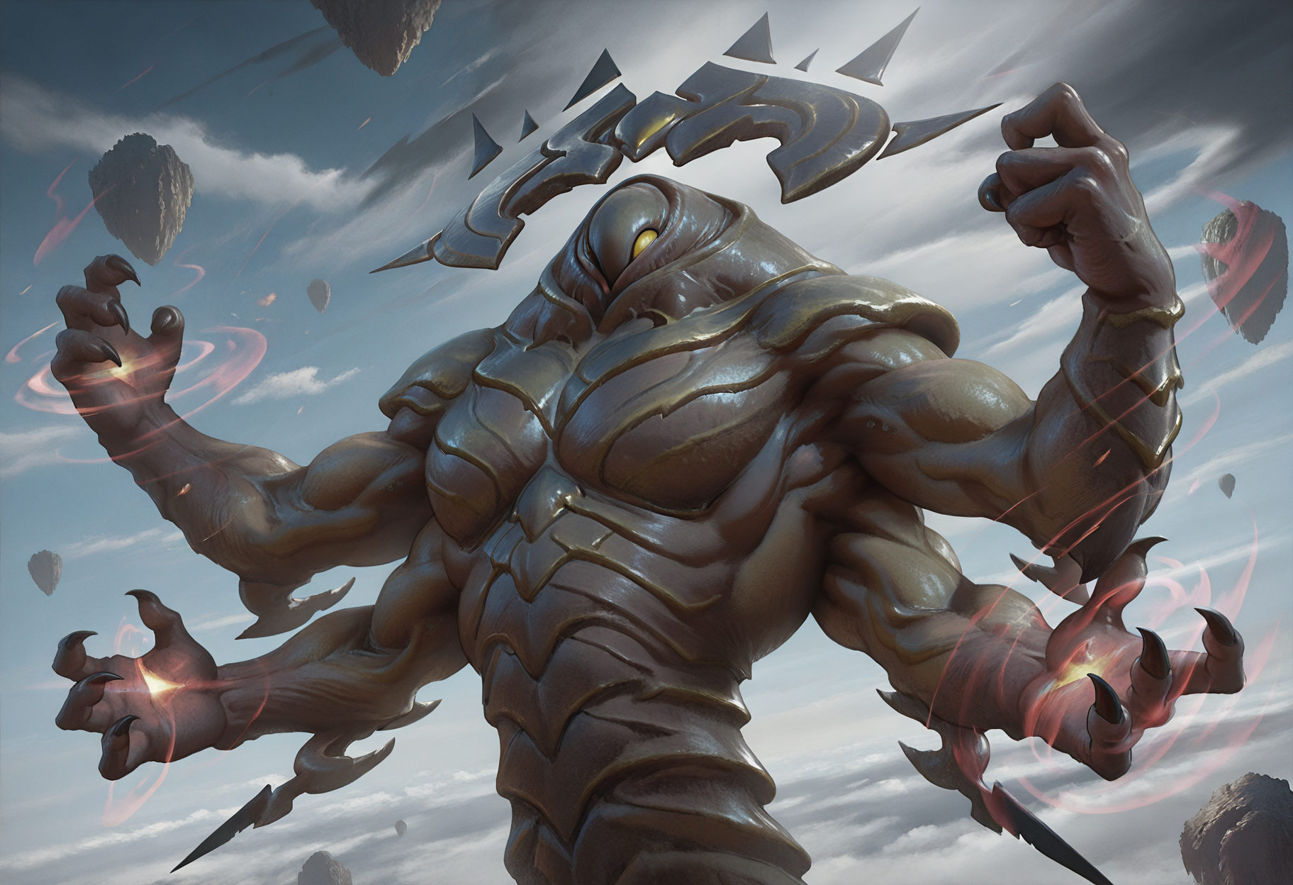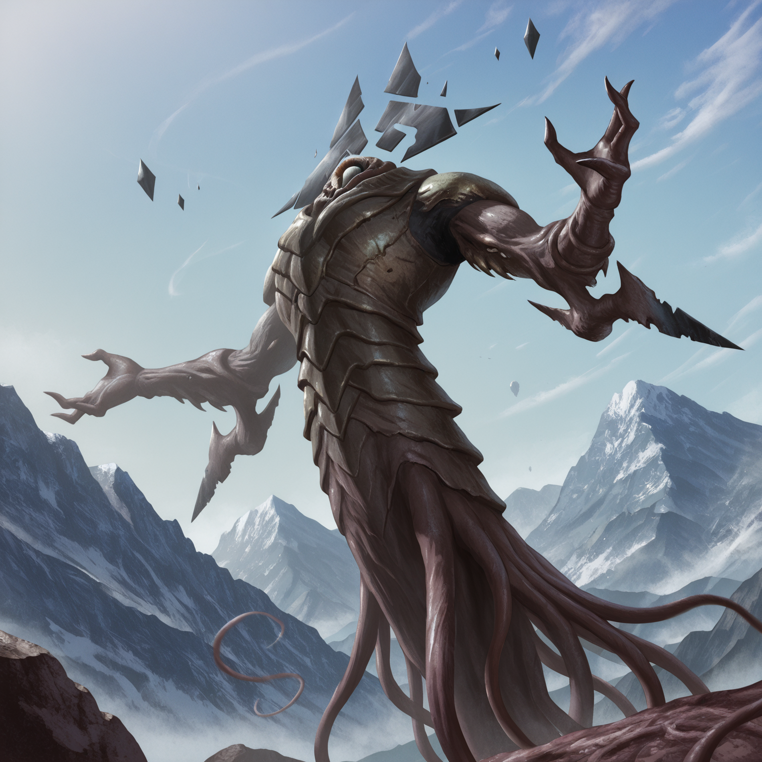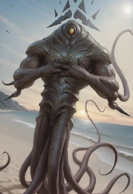 태그: 몬스터, 인간 없음, 엘드리치 비정상, 겉갑 갑옷, 기묘한 머리, 촉수 다리, 떠다니는 기하학적 패턴, 팔 칼, 추가 팔, 팔에 눈, 왜곡 마법, 외계인