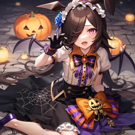 official alternate costume, halloween costume, hair flower, blue rose, hair ornament, frilled hairband, purple gloves, striped bowtie, black bowtie, brooch, puffy short sleeves, bat wings, collared shirt, white shirt, center frills, jack-o'-lantern, orange bow, high-waist skirt, medium skirt, purple skirt, spider web print, black skirt, purple footwear