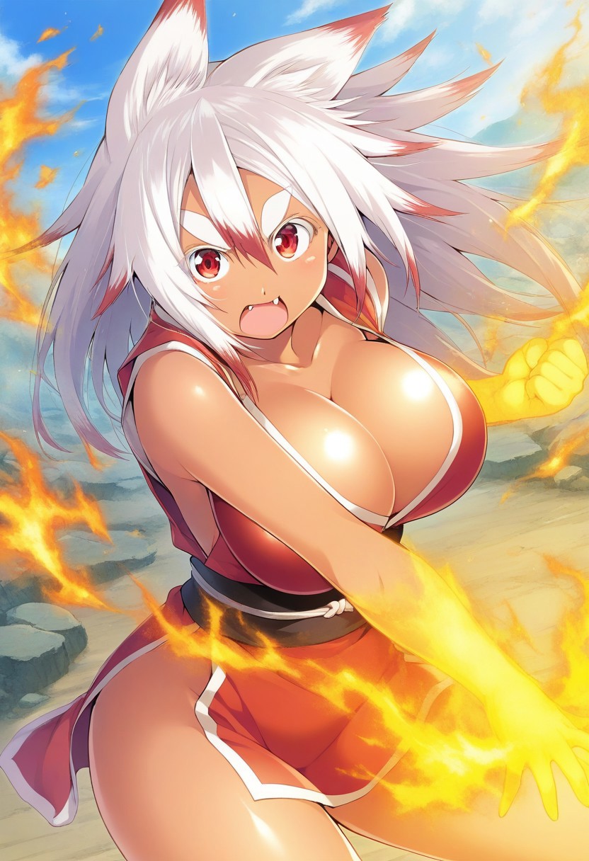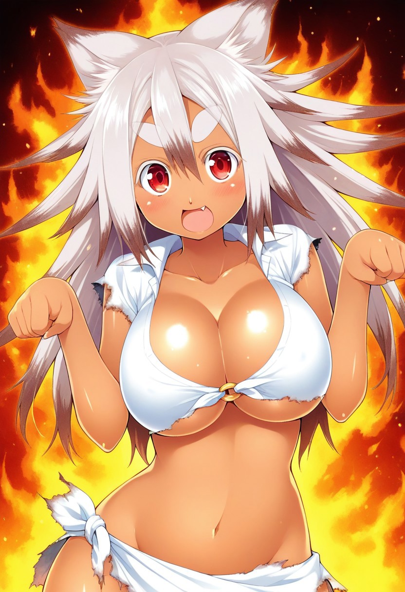 Kaen Higurama, 1girl, gray hair, long hair, spiked hair, thick eyebrows, dark skin, dark-skinned_female, red eyes, large breasts, fang, cleavage, animal ears, fox_ears, underboob, tied shirt, tied skirt, torn clothes, navel, popsicle container, popsicle