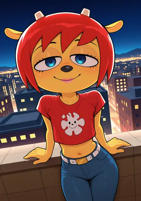 她的上衣短切效果未呈现出来,因此要么完全成功,要么彻底失败。请添加露脐装或肚脐细节以缩短上衣,但这样会比官方风格更短。否则,她只会穿着一件全长T恤。