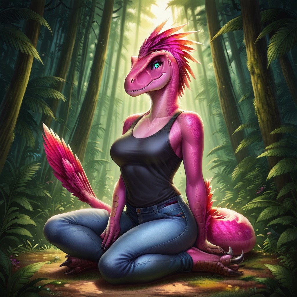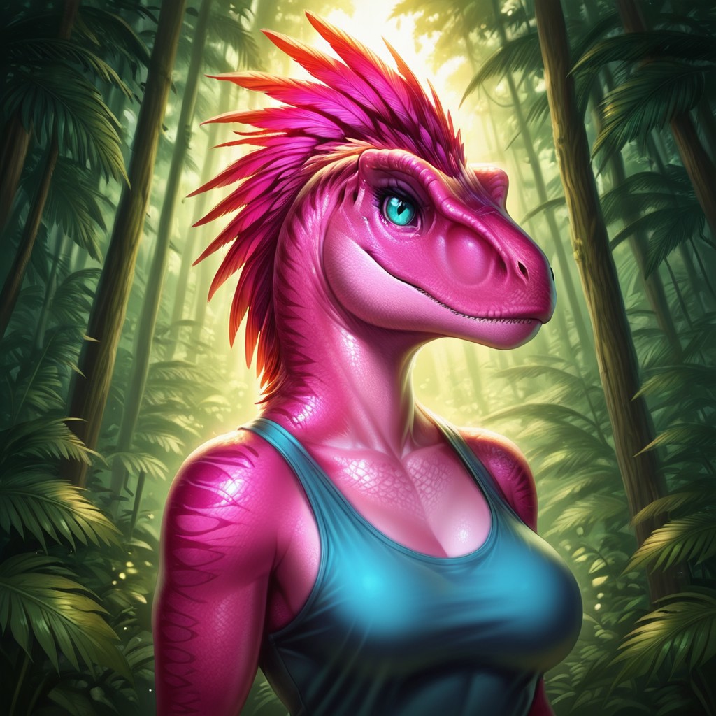 Vivian(character), anthro, raptor, dinosaur, pink body, feather body,