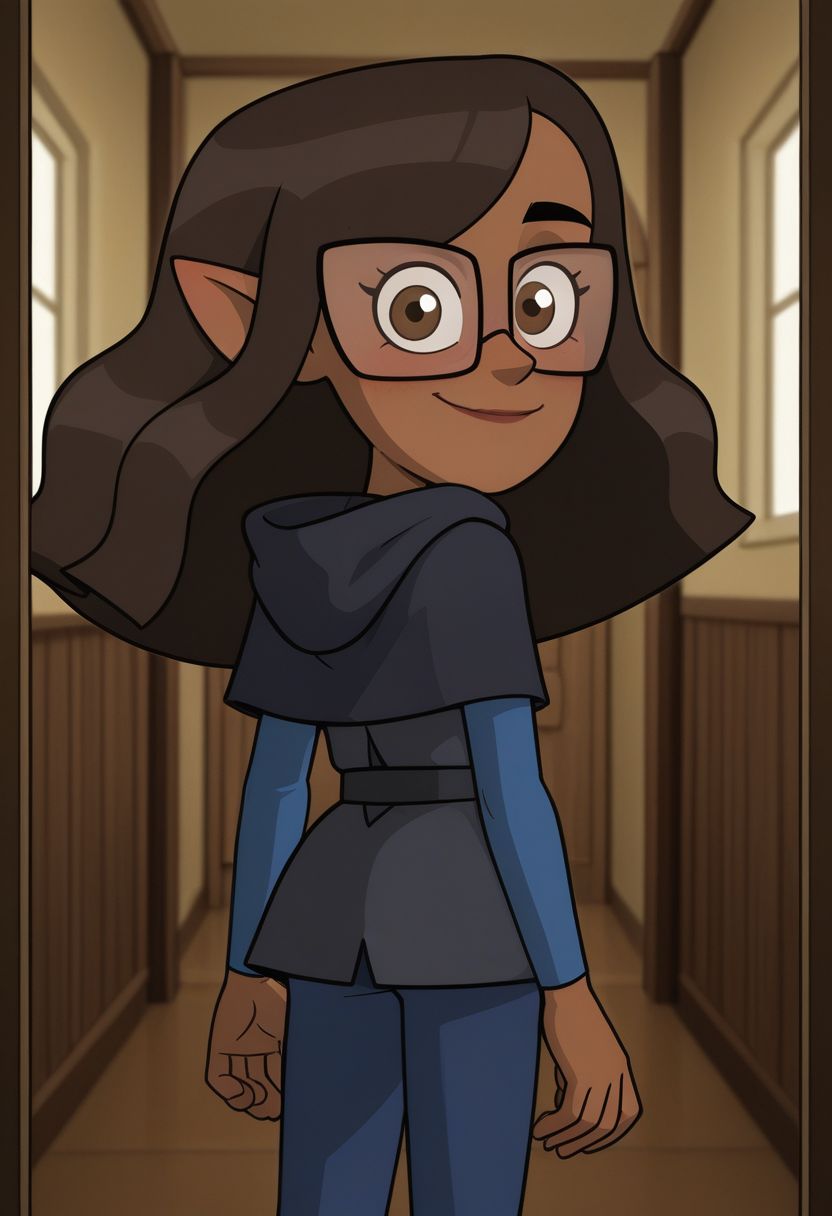 프롬프트: cat_(the_owl_house), 1girl, 갈색 머리카락, 긴 머리카락, 검은 피부를 가진 여자, 갈색 눈, 캐프렛, 긴 소매, 벨트, 파란 바지
