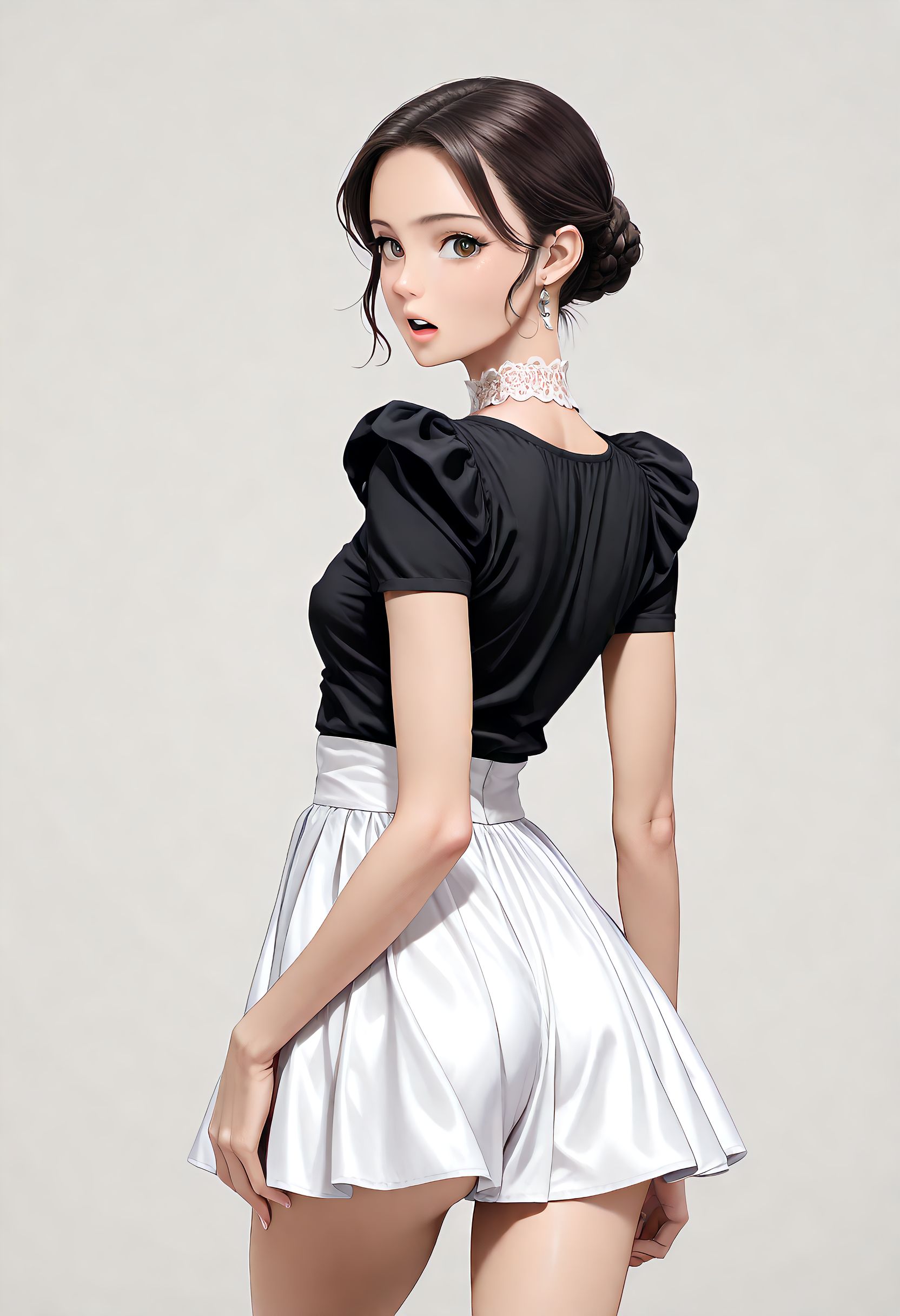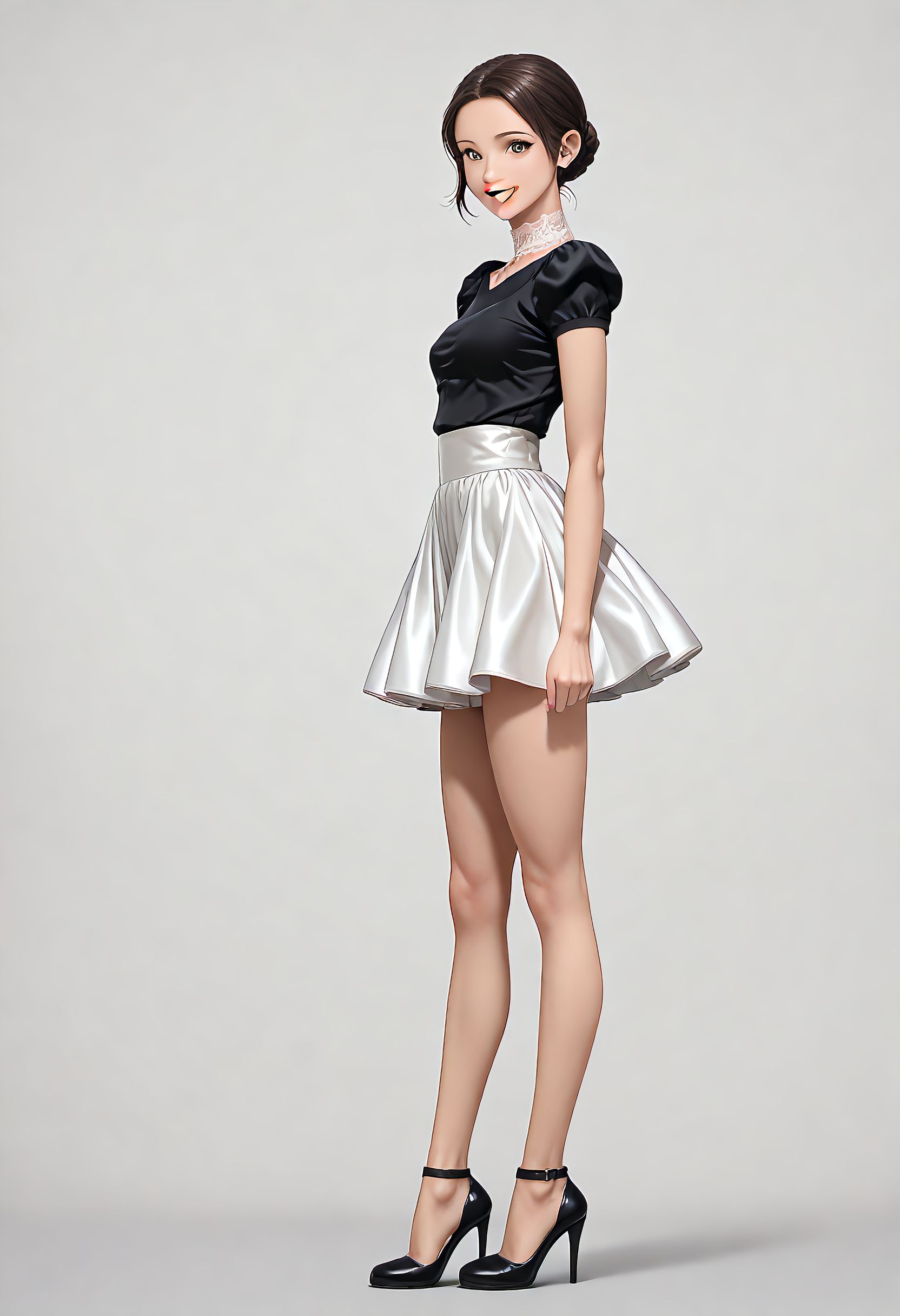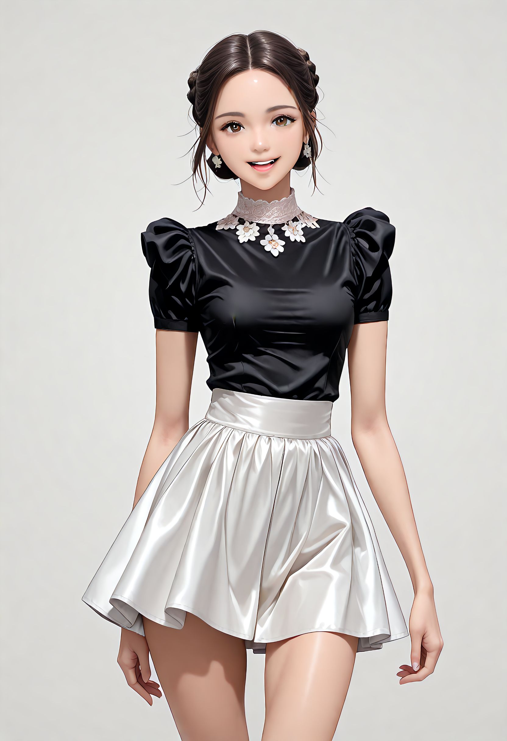 D065_드레스, 라운드 넥 짧은 퍼프 티셔츠, 검은 비단 셔츠, 흰색 레이스 칼라, 흰색 비단 하이웨스트 플리츠 짧은 치마, 플로팅 스커트, 반짝이는 의상,