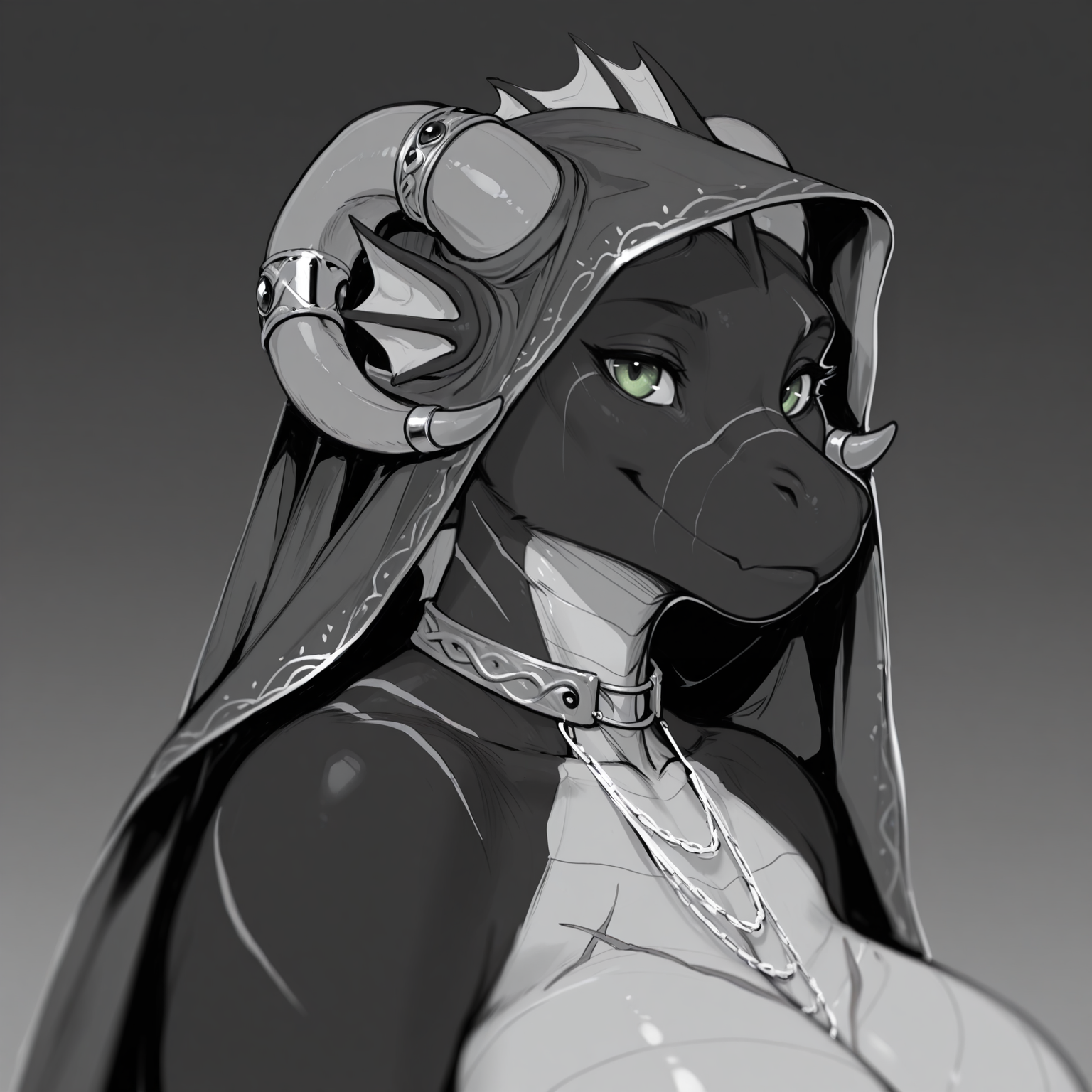 linna auriandi, furry, furry female, anthro, intersex, gynomorph, futa, futanari, dragon, mythology, mythological creature, mythological scalie, western dragon, scales, black body, white body, black scales, white scales, ventral scales, green eyes, chest scar, abdominal scar, facial scar, leg scar, thigh scar, scar, horn, fin, head fin, curved horn, curled horn, horn jewelry, jewelry, necklace, piercing, knocker piercing, ring (jewelry), ear fins, nipple piercing, huge breasts, large breasts, black areolae, black nipples, huge penis, animal penis, equine penis, knot, knotted equine penis, knotted penis, black penis, huge testicles, white testicles, hybrid penis, slightly chubby, thick thighs, wide hips, nails, tail, thick tail
