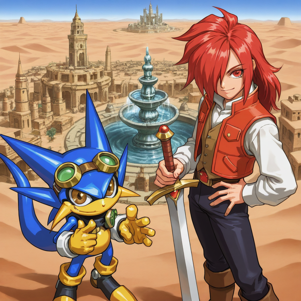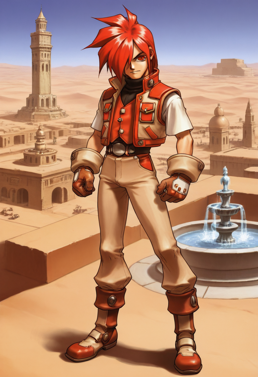 Koh: 1boy, koh, male focus, 1boy, gloves, red eyes, hair over one eye, red hair, boots, vest