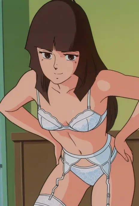 YurikoLingerie, retro artstyle, 1970s \(style\), 1girl, solo, brown hair, long hair, brown eyes, medium breast, large hips, lingerie, underwear, white bra, navel, white panties, white garter belt, white garter straps, white thighhighs,