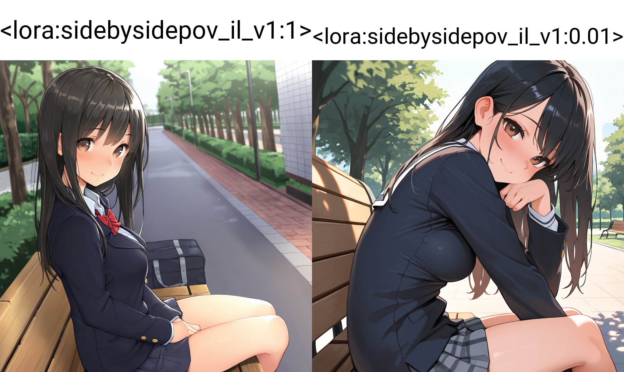 キャラクターの隣に座った状態で第一人称視点の構図を生成するためのLoRA。