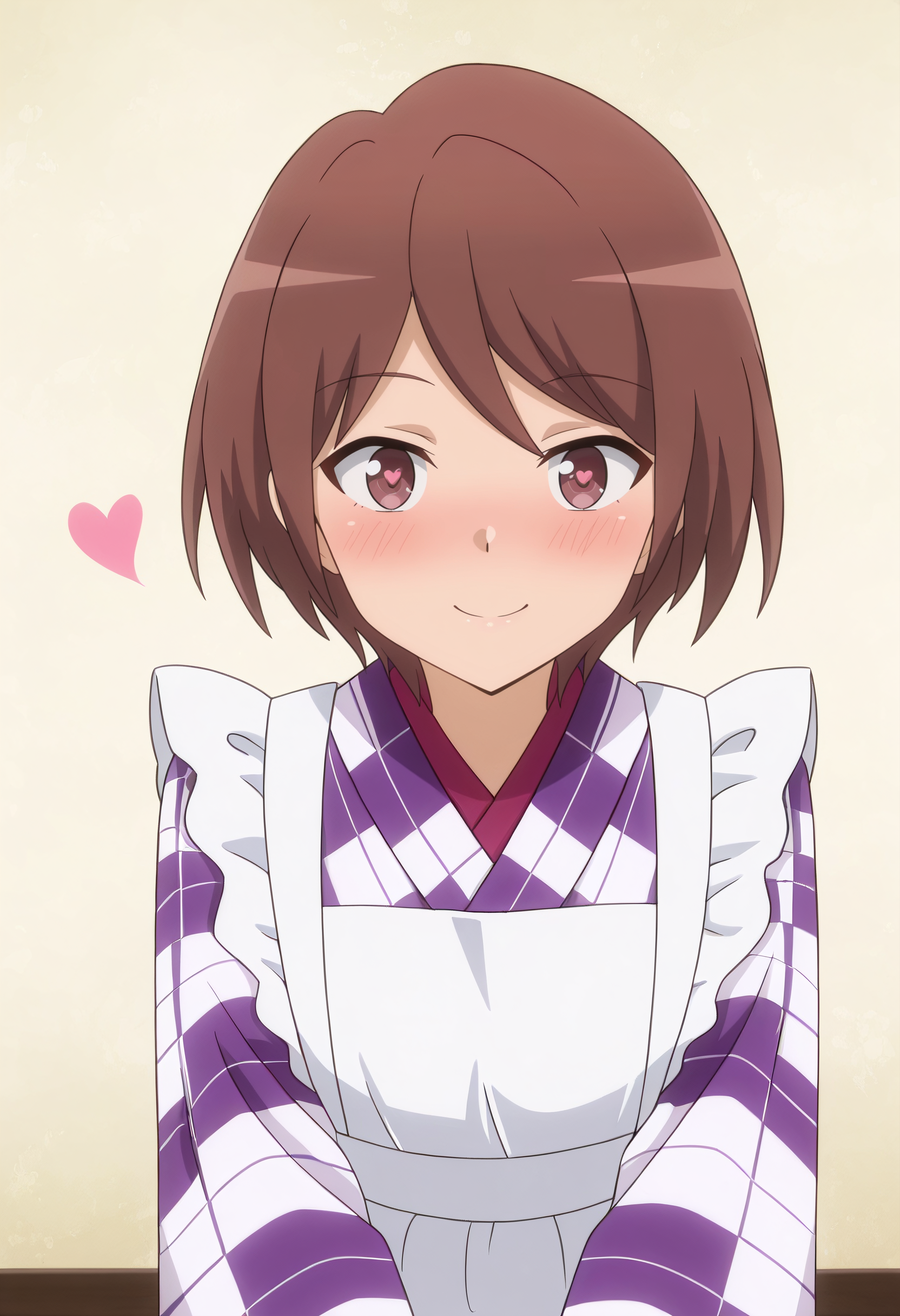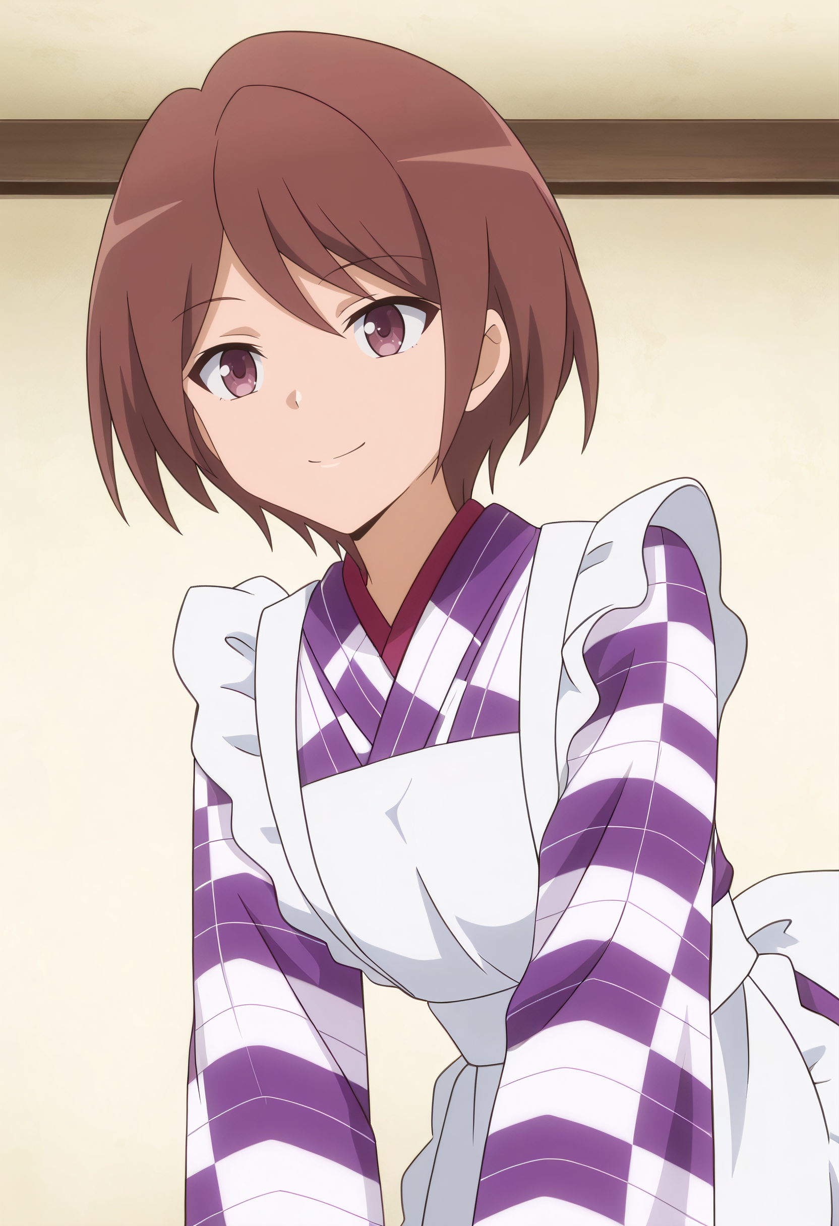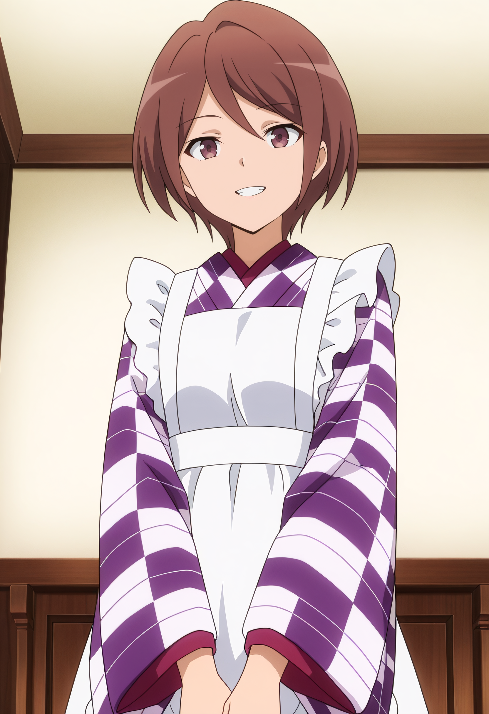 SulasOutfit、エプロン、着物、日本の服、チェック柄の服、メイド、白いエプロン、フリル付きエプロン、WAメイド、チェック柄の着物、長袖、紫色の着物、広い袖、メイドエプロン、フリル、メイド頭飾り、
