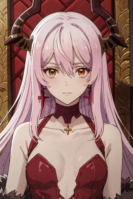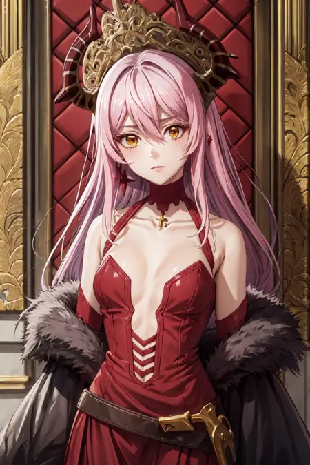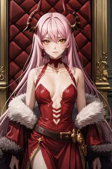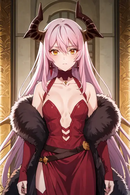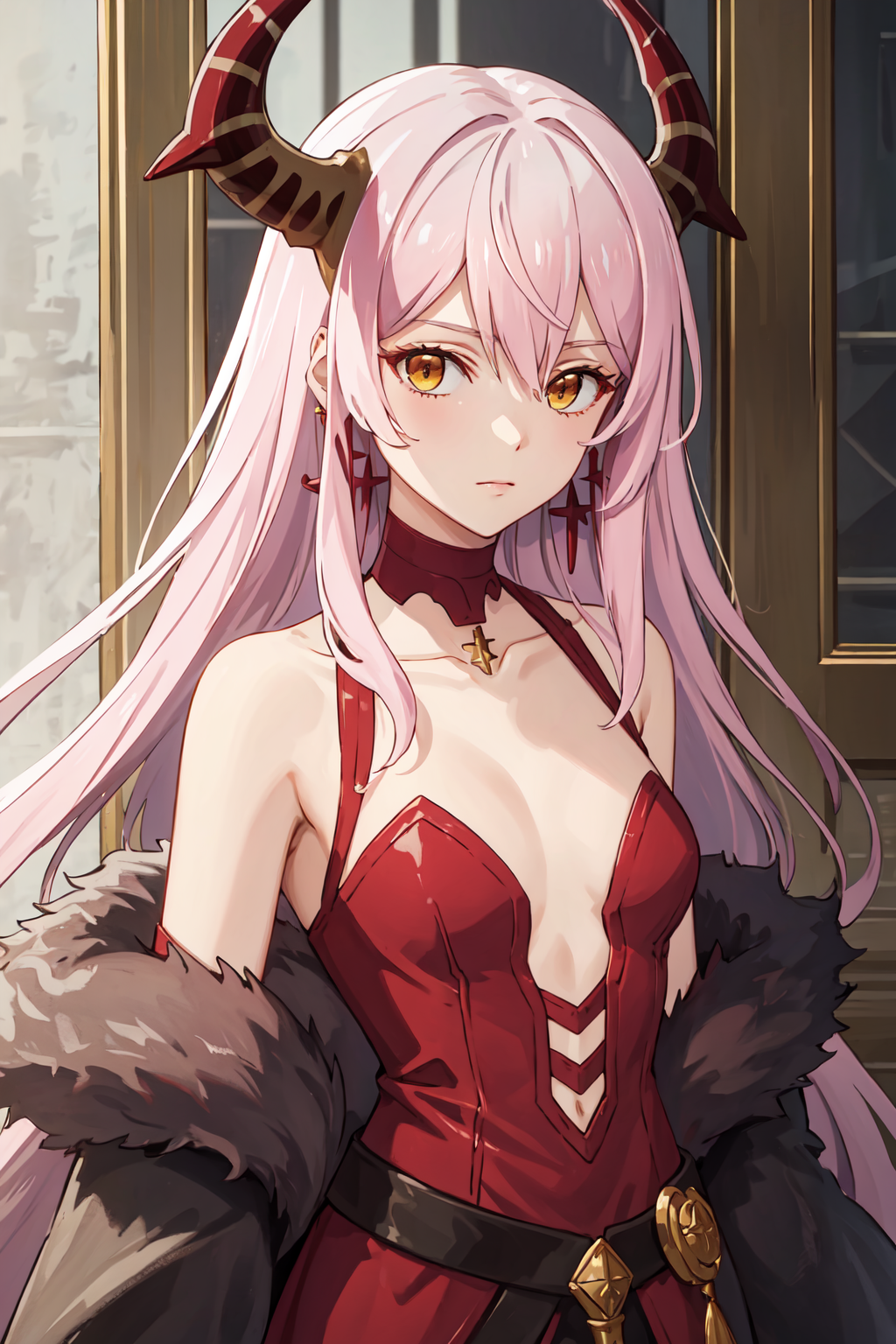 ((best quality, high quality, masterpiece, highres)), echidna, 1girl, dress, choker, fur trim, bare shoulders, earrings, cowboy shot, collarbone, looking at viewer