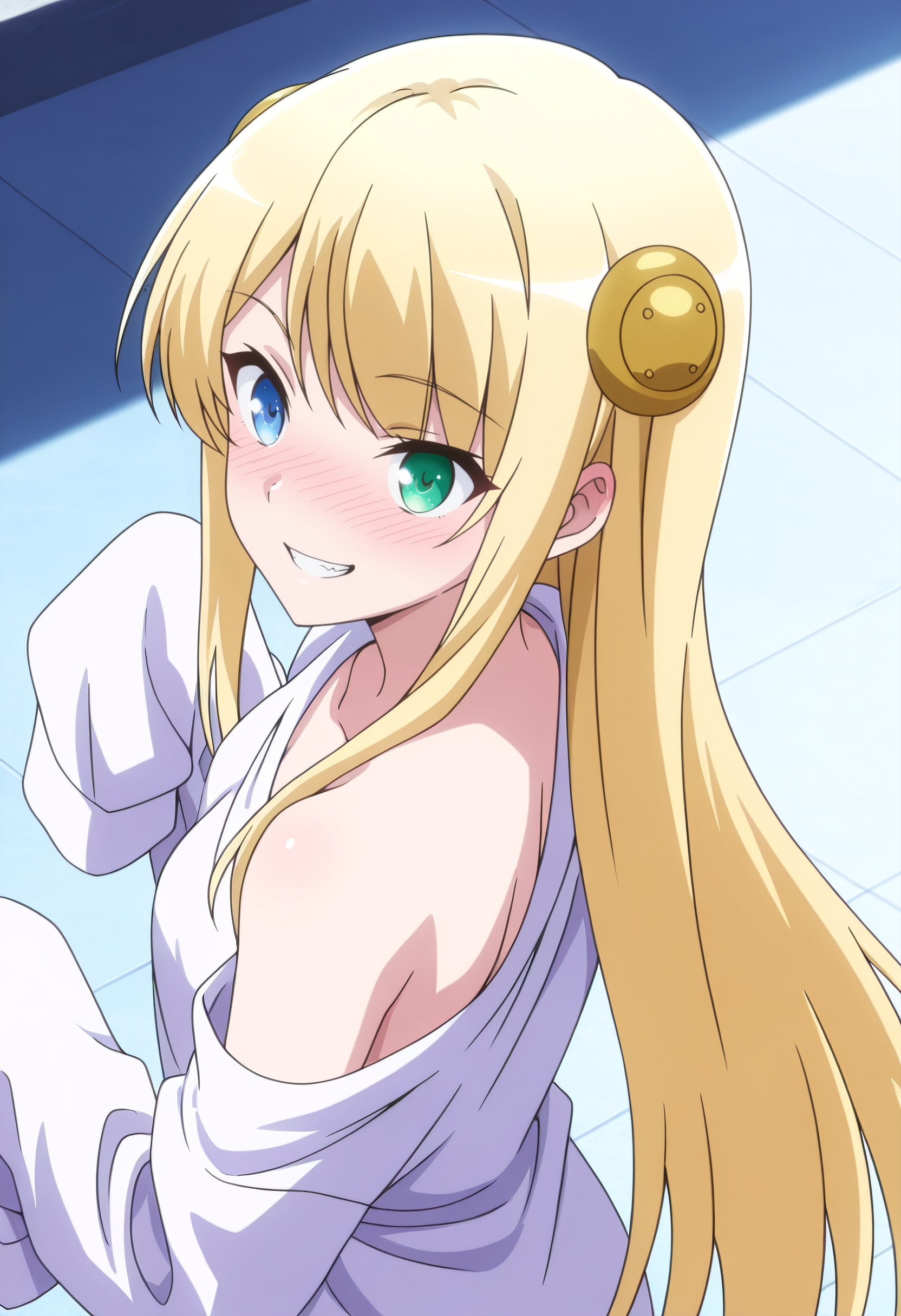YuminaOversizedShirt, 쇄골, 한쪽 어깨 노출, 머리 장식, 고대 그리스 복장, 그리스-로마 복장, 어깨 노출, 오버사이즈 복장, 오버사이즈 셔츠, 셔츠, 노출 셔츠, 흰 셔츠, 손목을 넘는 소매, 긴 소매, 손가락을 넘는 소매, 헤어팟,