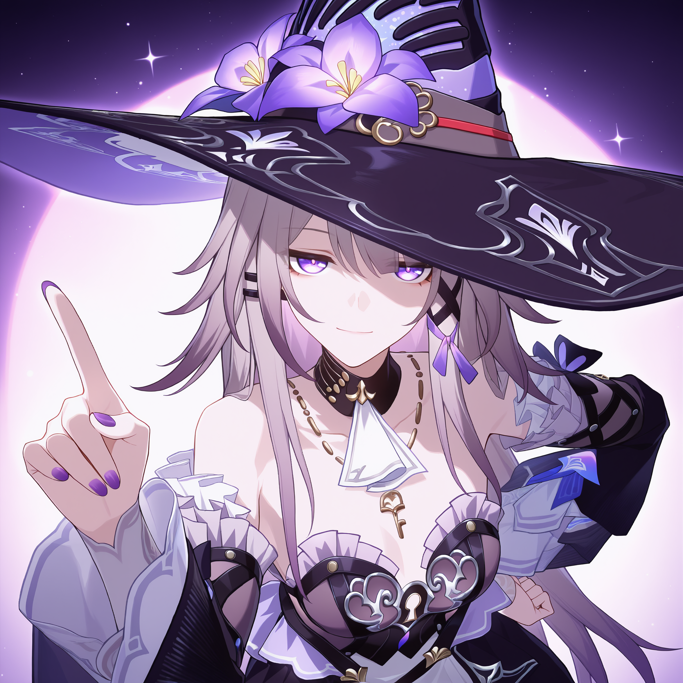 masterpiece, best quality, amazing quality, very aesthetic, 1girl, The Herta, mihoyo, hat, long hair, jewelry, dress, witch hat, earrings, bangs, hat flower, necklace, bare shoulders, cleavage, purple nail polish, looking at viewer, romantic, love, cute, playful, detailed light, epic, dramatic,풀 바디 프롬프트: