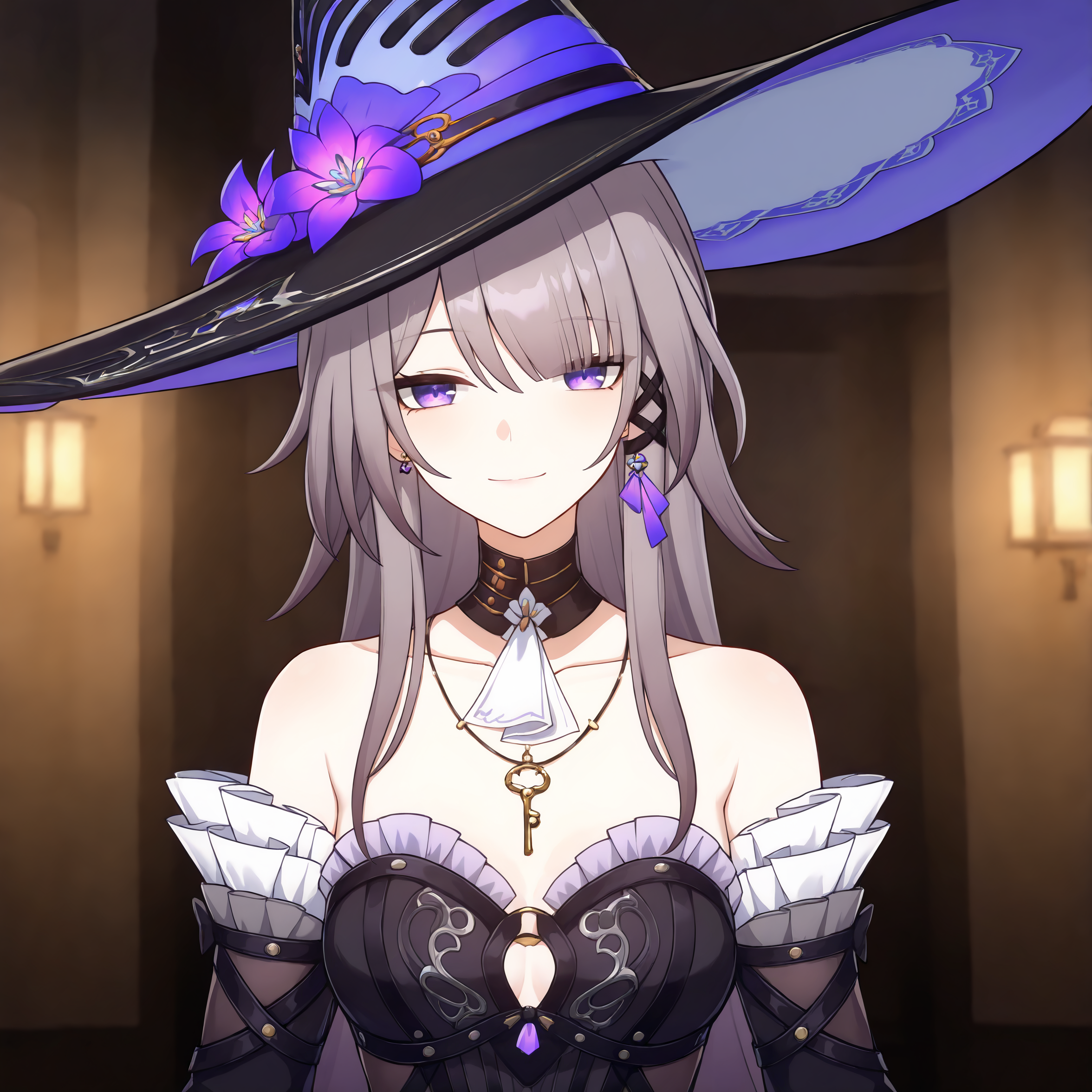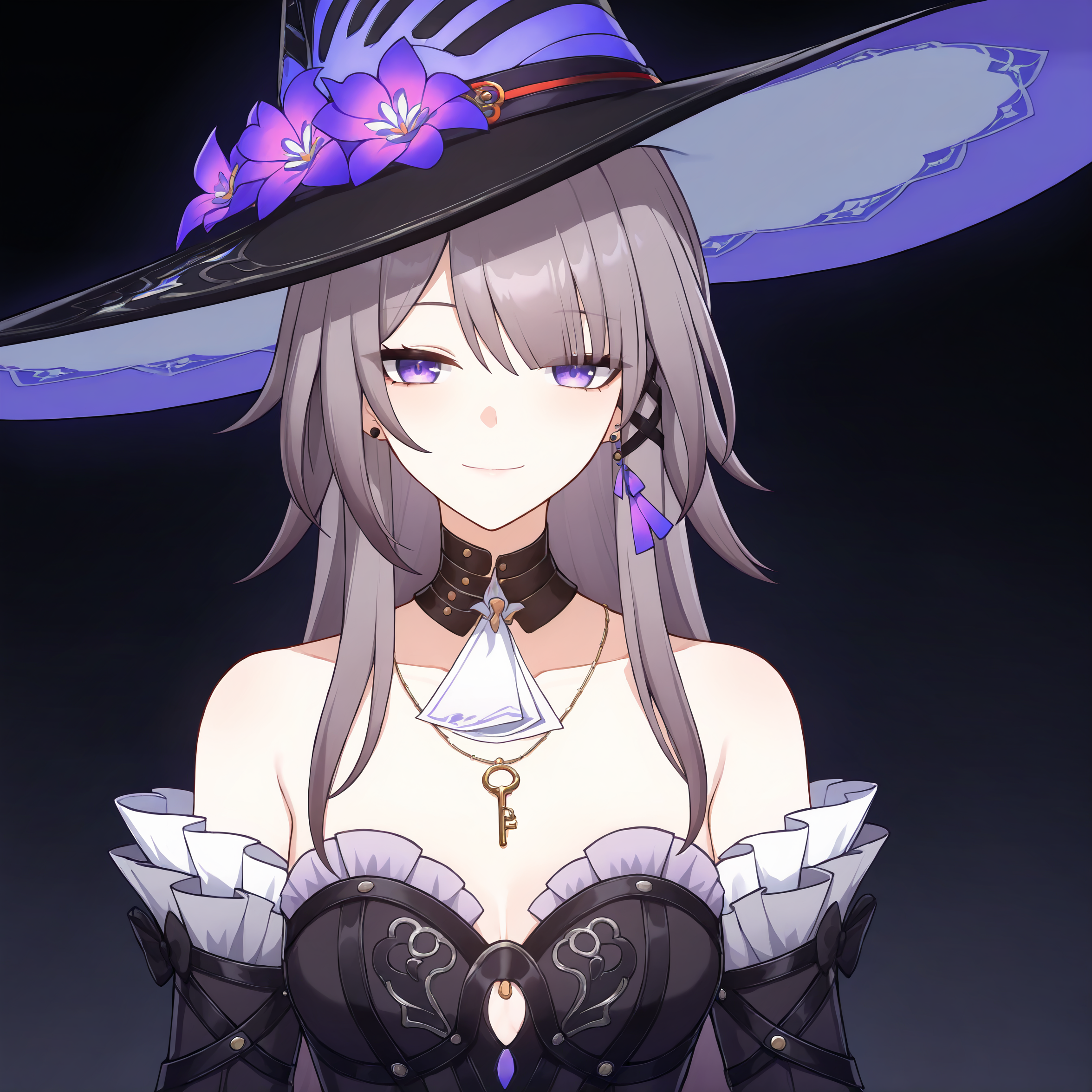 masterpiece, best quality, aesthetic, The Herta, 1girl, solo, hat, long hair, detached sleeves, jewelry, dress, witch hat, earrings, flower, bangs, hat flower, necklace, key, bare shoulders, black dress, frilled sleeves, black headwear, grey hair, frills, long sleeves, cross, purple flower, light smile,