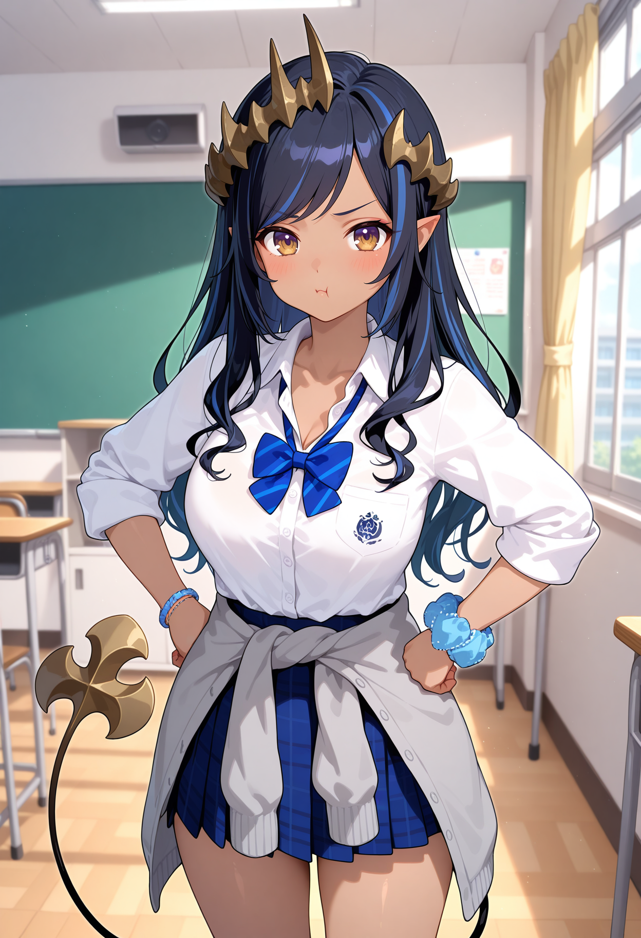 eechar, long hair, black hair, streaked hair, horns, dark-skinned female, swept bangs, pointy ears, demon tail, school uniform, blue bowtie, collared shirt, white shirt, sleeves rolled up, wrist scrunchie, bracelet, grey cardigan, cardigan around waist, plaid skirt, blue skirt