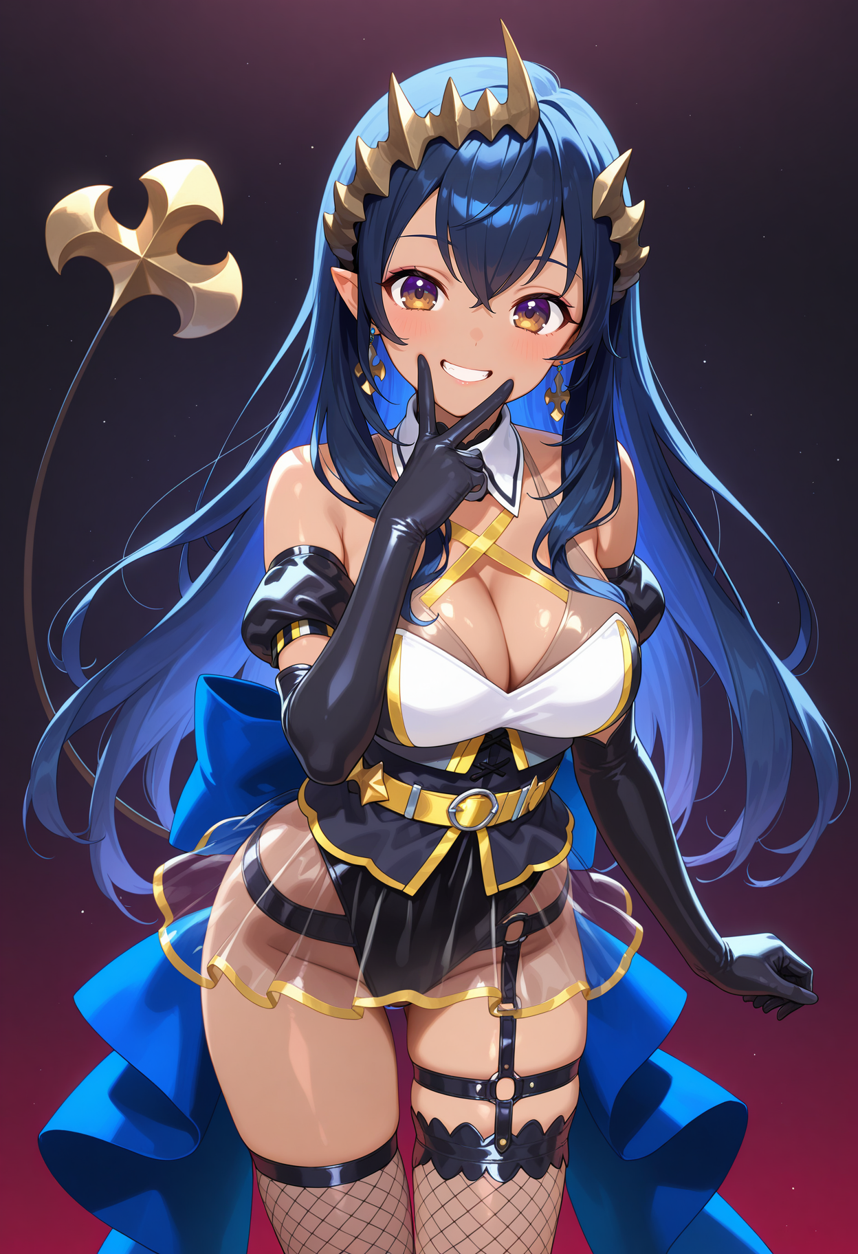 ffchar, long hair, black hair, horns, dark-skinned female, pointy ears, demon tail, earrings, detached collar, criss-cross straps, leotard under clothes, underbust, sleeveless, detached sleeves, elbow gloves, black gloves, see-through skirt, garter straps, fishnet thighhighs