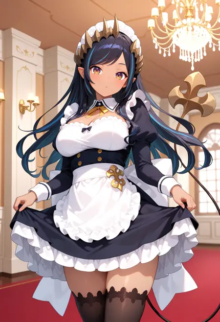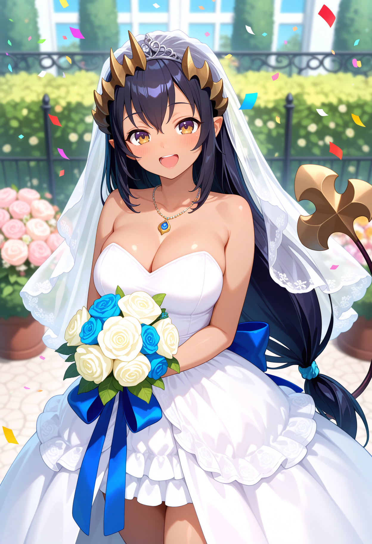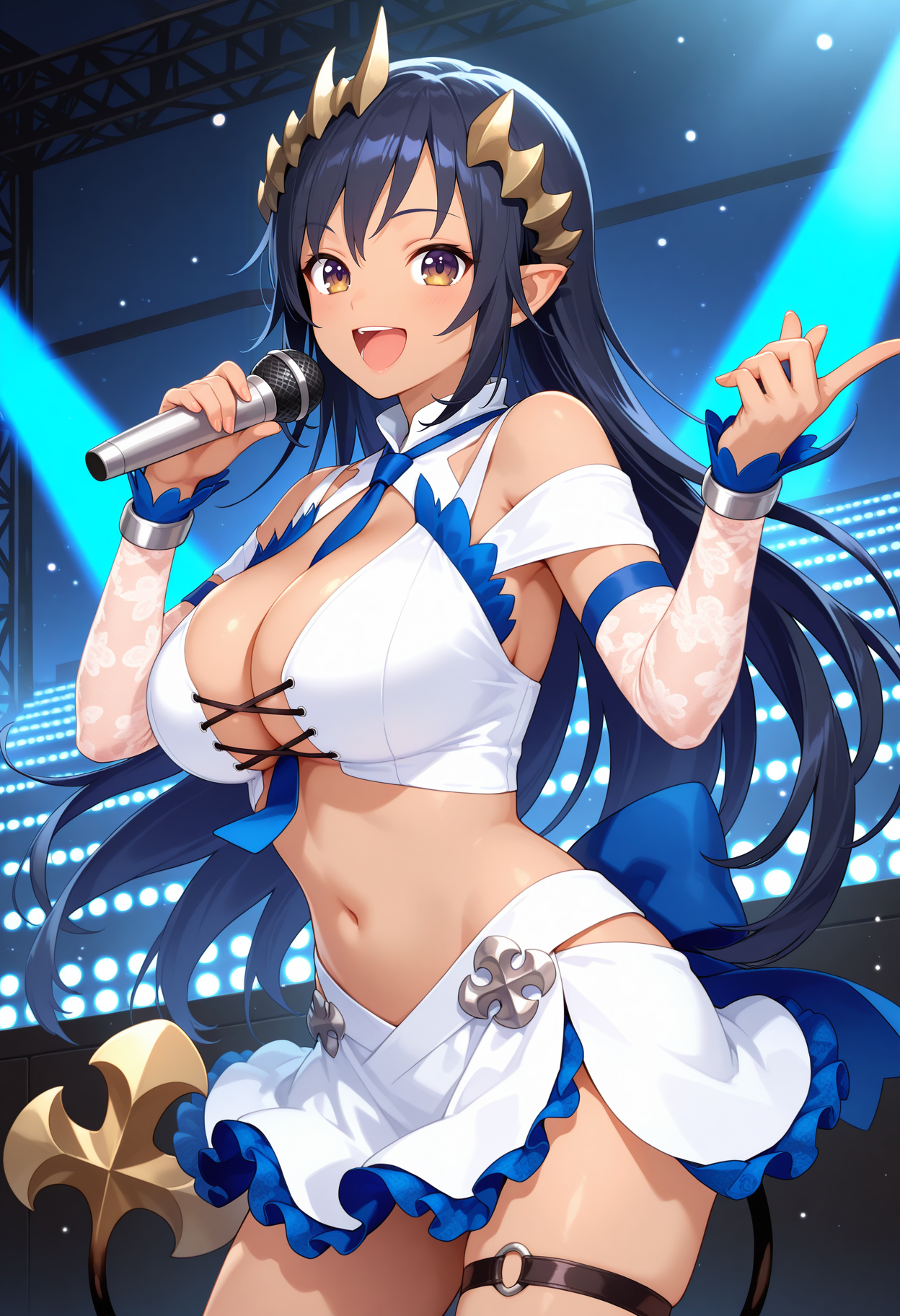 ccchar, long hair, black hair, horns, dark-skinned female, pointy ears, demon tail, blue necktie, shoulder cutout, cross-laced clothes, crop top, detached sleeves, lace sleeves, white skirt, side slit, thigh strap