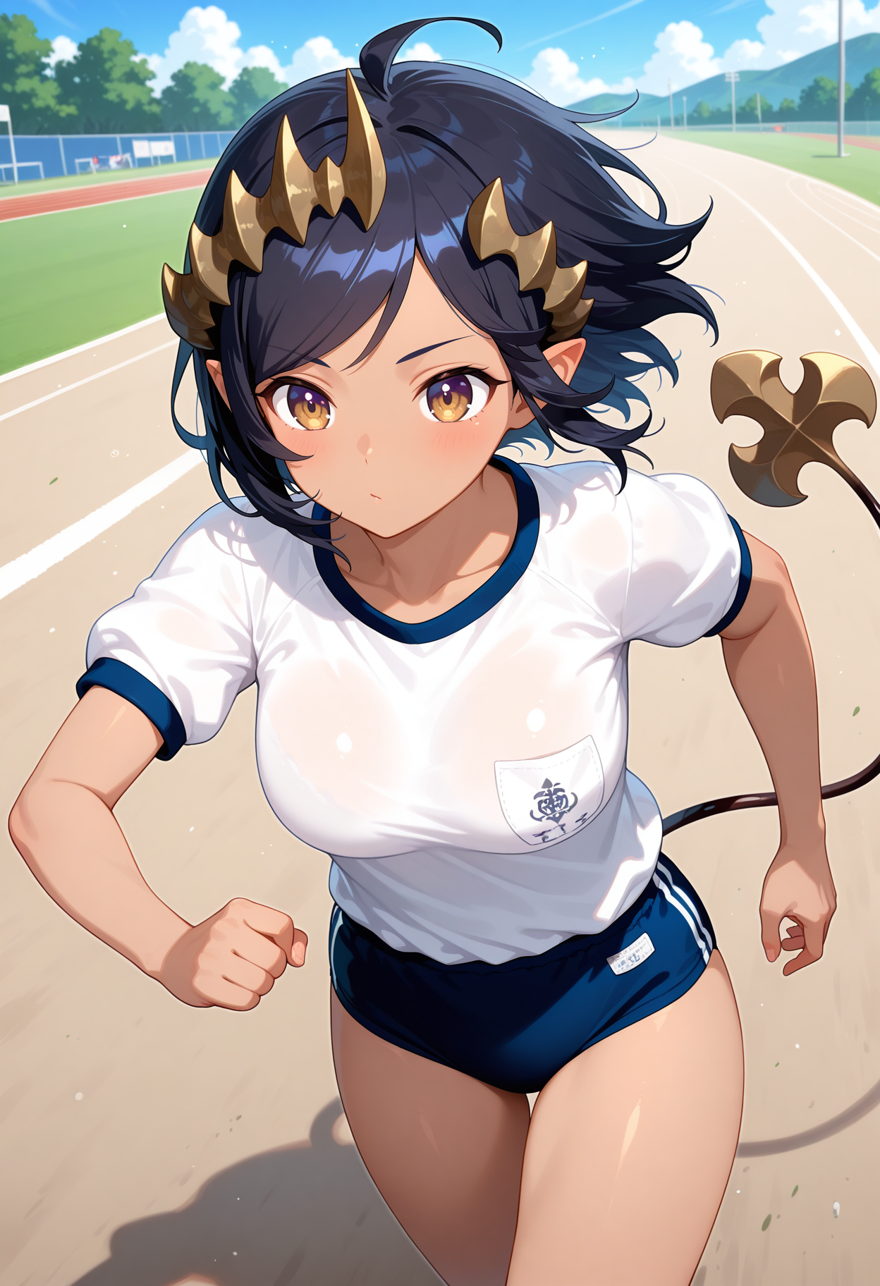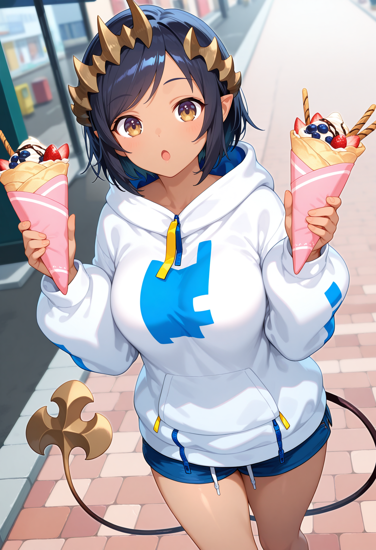 bbchar, short hair, black hair, horns, dark-skinned female, swept bangs, pointy ears, demon tail, white hoodie, long sleeves, short shorts, blue shorts