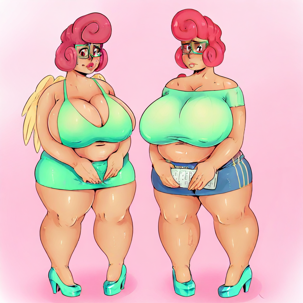 Posey Shy, Sundown (Artist), humanized, plump, curvy, mature female, red hair, red eyes, small yellow wings, green glasses, dress shirt, skirt, high heels