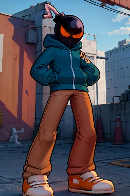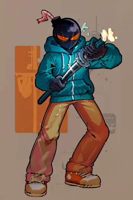 The main prompt is "WhittyFNF, bomb head, blue hoodie, orange pants, orange sneakers".